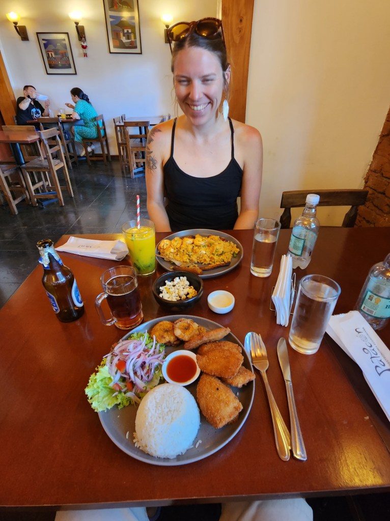 With a claim filed, we finally left the airport around 1 pm. Maggie and I took a bus downtown for $2, watching Santiago fly by through the windows. I like to think I tempered my expectations, but at first glance, I was not impressed. There was lots of litter and plenty of dilapidated buildings, at least on the outskirts of the city. I was getting that sinking feeling in my chest, “What was I thinking coming here..?” Things gradually became more vibrant as we got closer to the city center. We got off the bus at Los Heroes station, then walked the remaining mile and a half to our hostel. Our route was along Avenida Bernaro O’higgins, a very busy boulevard. There were pockets of busy pop up markets selling wares and food. It was a lot of stimulation to kick off our stay in Santiago. Along the way, we stopped to exchange some cash. The man behind the counter told us to be careful, but also that crime in Santiago typically isn’t violent. Just carry valuables in front so pick pockets don’t take your stuff. We quickly noticed locals and tourists alike carrying their purses and fanny packs in this manner. After stumbling a few more blocks, we made it to our hostel at 2 pm. The receptionists were so nice and they spoke English. We got to our room and pretty quickly laid down for a quick nap. I think we easily could have stayed in bed all afternoon, but starvation was catching up to us. Going to sleep in the afternoon would have screwed up our sleep schedule, so we walked around the corner for a late lunch at a cozy little Ecuadorian style restaurant. This would be our first of many embarrassing language barrier moments. Our waitress was very nice and patient. She slowed down her Spanish and simplified her questions. After deciphering the menu for 10 minutes, I got fried fish and plantains, and Maggie got shrimp and rice.