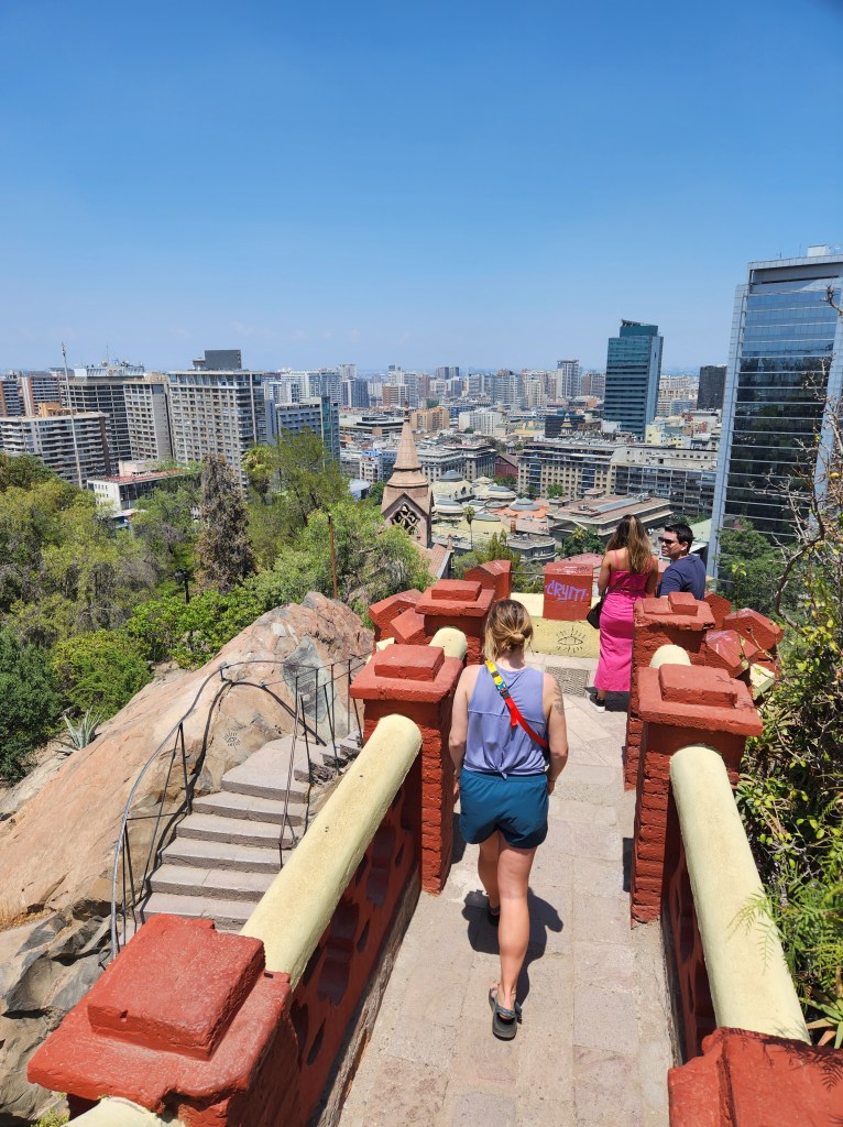 The portions were huge! Even though we were starving from our travels, we both had to take half the food back to the hostel. Maggie and I needed to keep moving, otherwise we were going to fall asleep. We walked to Cerro Santa Lucia, a little hilltop park in the middle of the city. As we were ascending some steps, another young American couple passed by. I recognized them from our flight, so we stopped and talked for a few minutes. They were heading straight down to Torres del Paine the next day, and we wished them luck on their adventure.