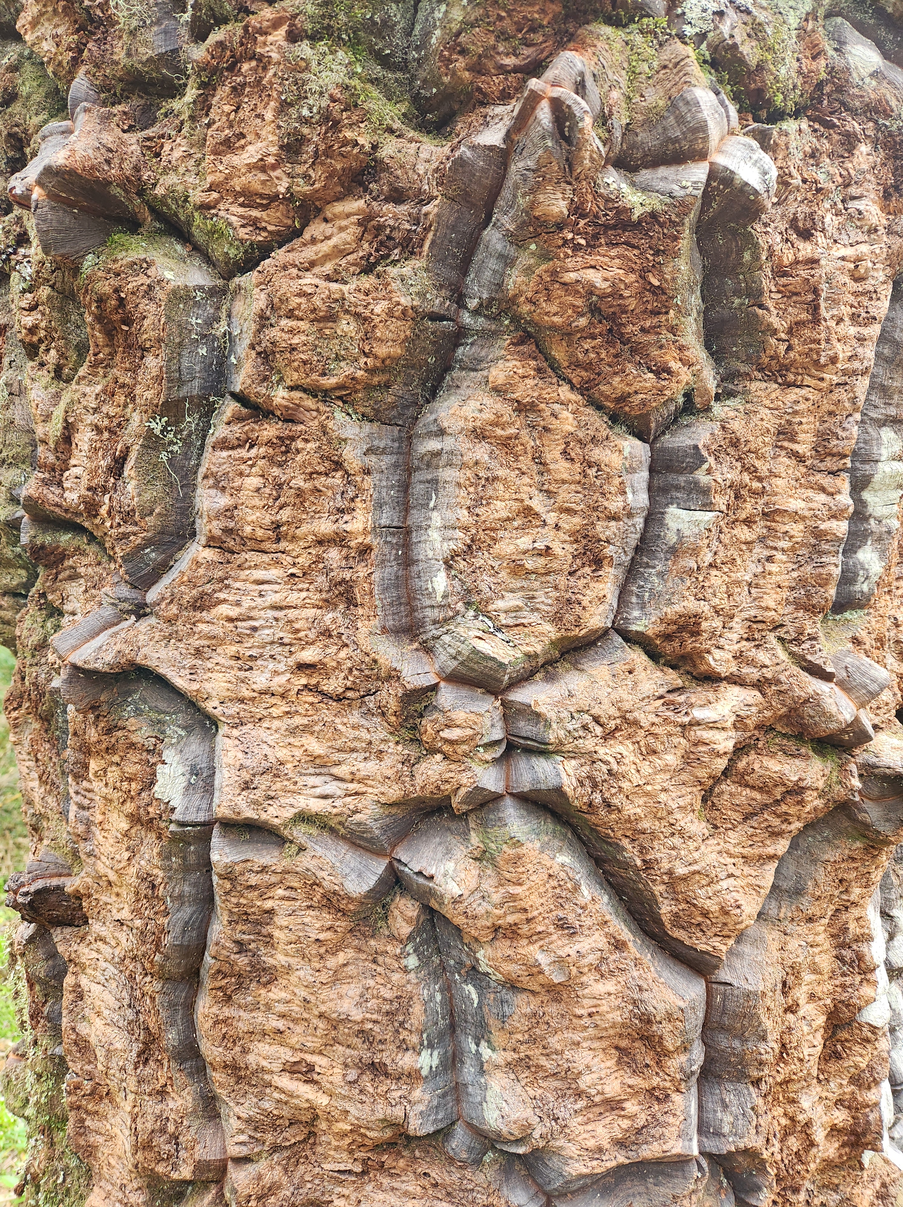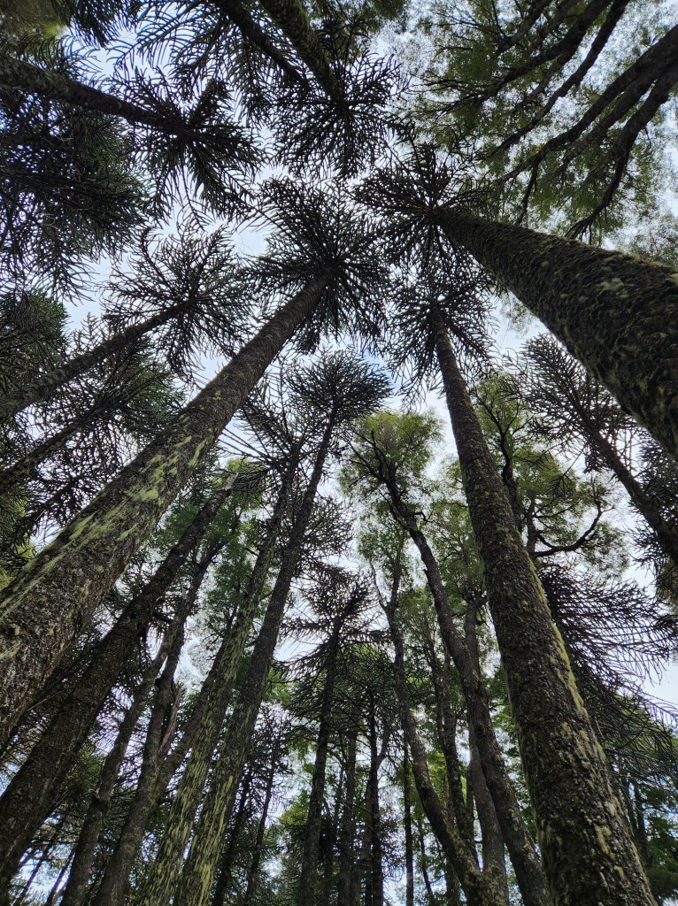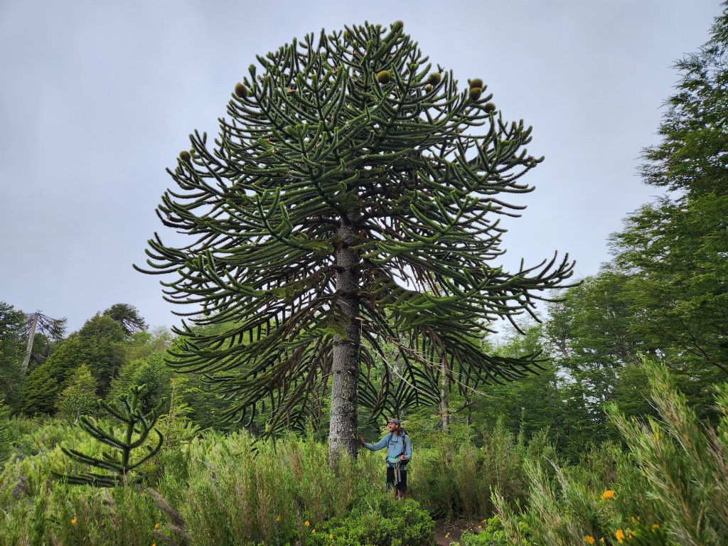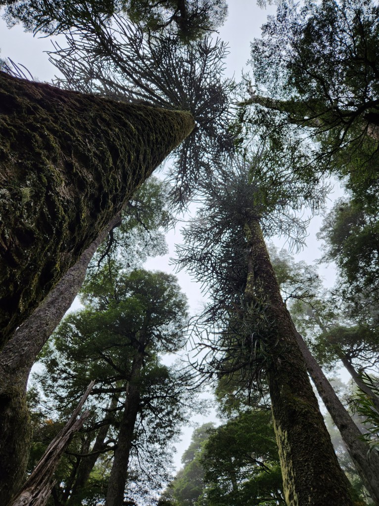 Upwards, we started getting some views of the lake, but the clouds were rolling back in, obscuring the mountains. I was content to gawk at the Araucarias all around. A pale yellow lichen, much like old man’s beard, typically drapes the bark of the Araucarias. From a distance, you can see these pale yellow tree trunks sticking up between the greenery, showing you where the big, old trees are. The bark is especially interesting, often forming these irregular polygons that bulge out from the edges, reminiscent of some mythical dinosaur skin.