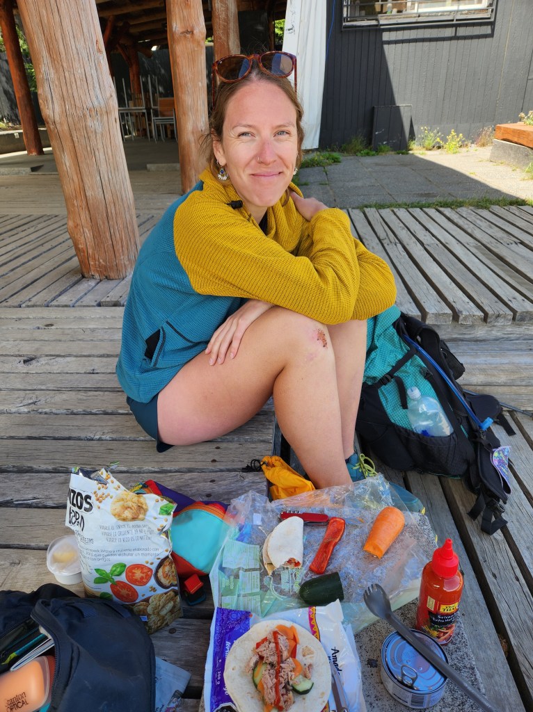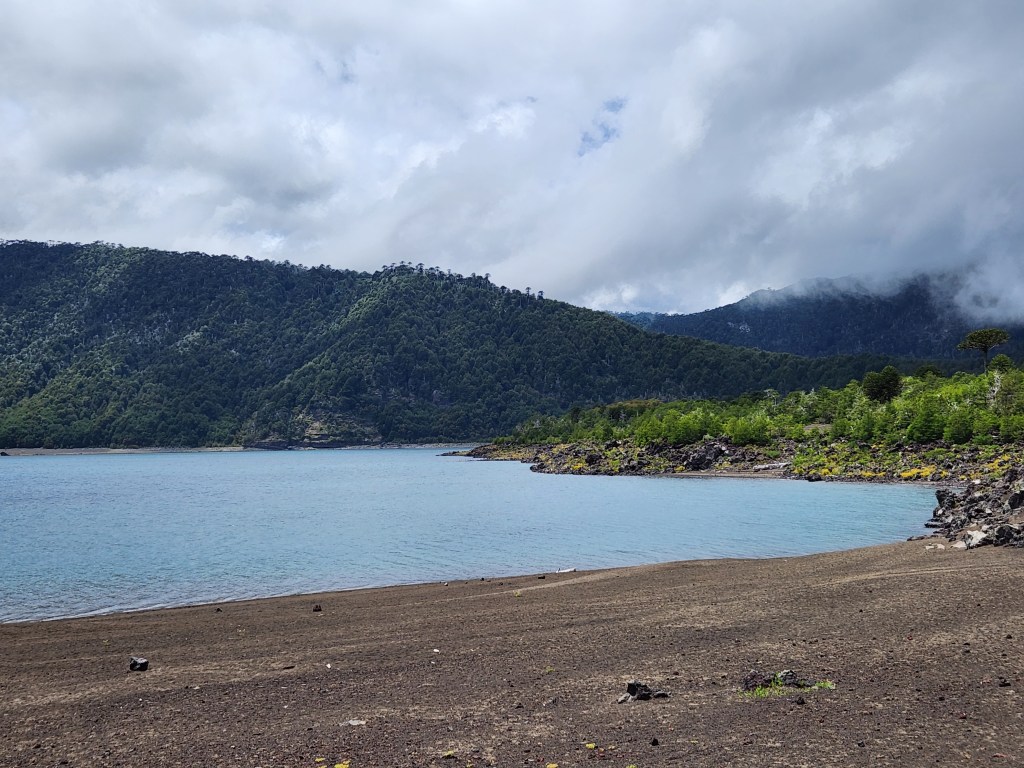 We started seeing people as we got closer to the visitor center, exchanging a friendly “Hola” with each passerby. We checked out the visitor center for a little bit, then found the camping reservation office. We booked a “mochilero” (backpacker) site for the night, then made lunch on the deck, overlooking Lago Conguillío. The sun had come out and people were filing in to the campground office.