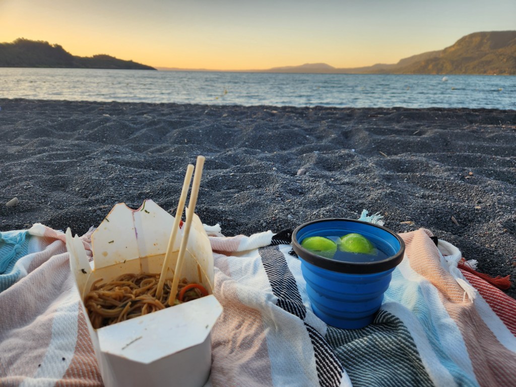 Volcán Villarrica was visible on the horizon, spewing small puffs of smoke as we walked through Pucón before dinner. Seeing all the volcanic activity, Maggie and I didn’t feel so bad about skipping the hike up there. We took our food to go and returned to the beach to watch the late summer sunset. G&Ts in hand, we ate as the sun dipped behind the horizon.