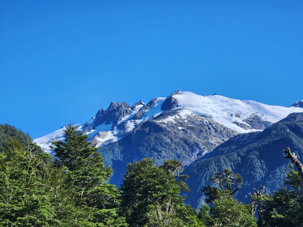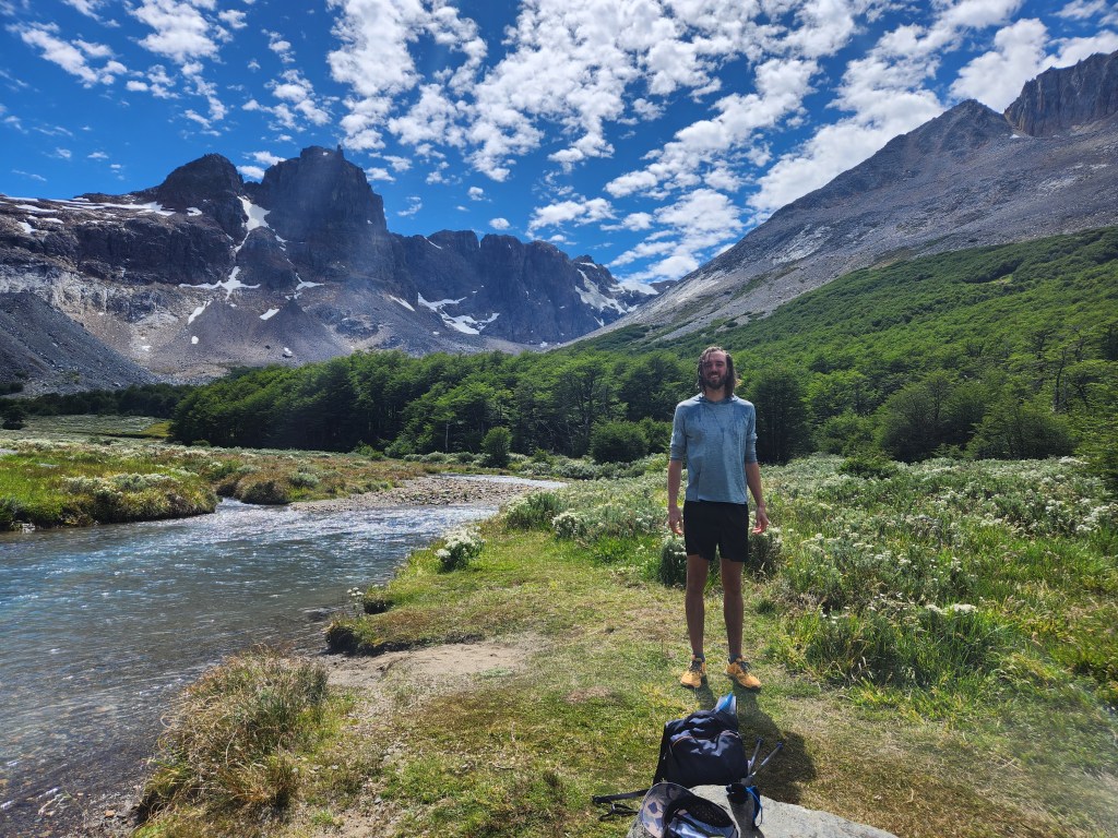 The trail began leveling out, and we passed through a backpacker camp, then continued a little further to tree line. We emerged from the forest in a striking alpine valley. Needles and spires rose up from the ridge line to the right, and Cerro Chocolate dominated the view to the left. The clear waters of Estero Parada cut right through the middle, where we splashed ourselves with the fresh Andean agua.