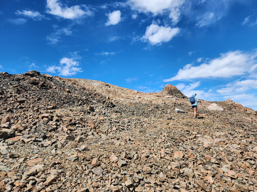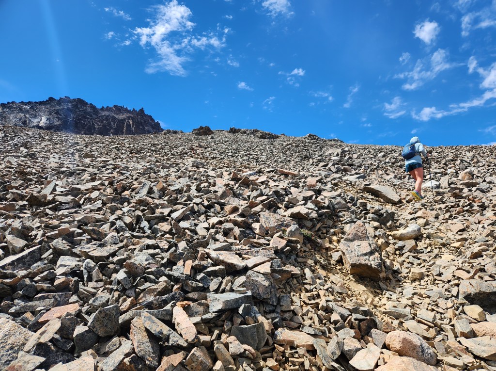 Maggie and I backtracked a little bit to a trail junction that would take us around to the lake, glacier, and mountain view point. This next bit of trail began climbing steeply out of the forest and we soon found ourselves ascending straight up scree and talus. We were leap-frogging with a tall man with long blonde hair and aviator sunglasses on the way up.