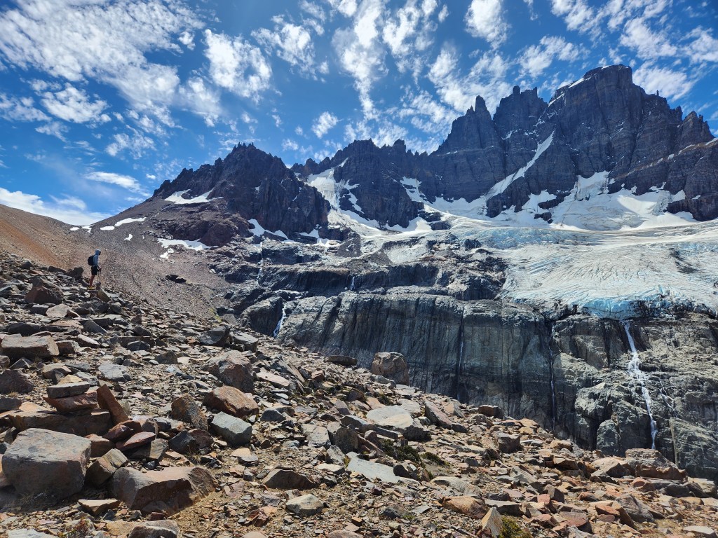 Feeling better, we set off, finishing the 2,500 foot climb. The views all around were gorgeous, with snow capped peaks in every direction. We finally crested over the top of the ridge and saw the Cerro Castillo glacier, and Cerro Castillo itself. The sights only got better and better as we descended around the south face with all the details of the rock and ice coming into view. Waterfalls dripped out of the toe of the glacier, feeding the hazy, blue lake below. The wind picked up, offering a cooling breeze as we hiked into the late afternoon. All said, the stoke was high.