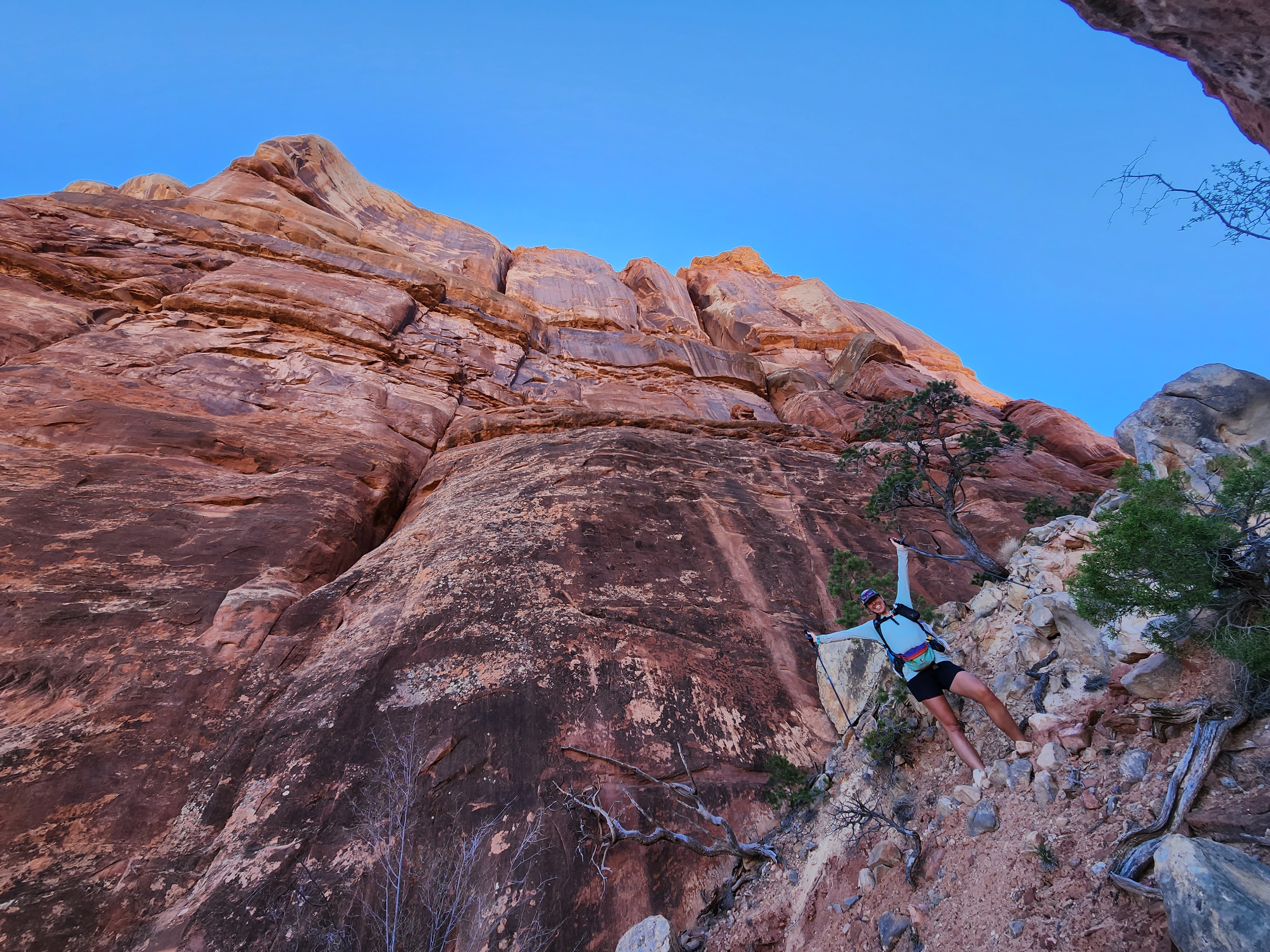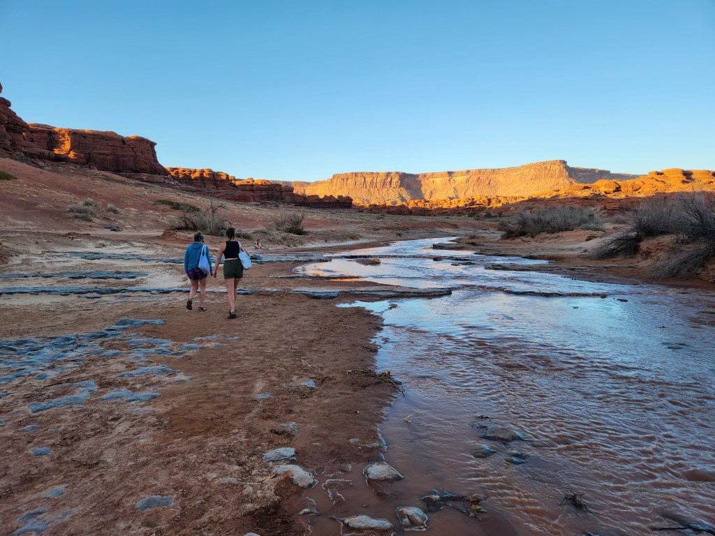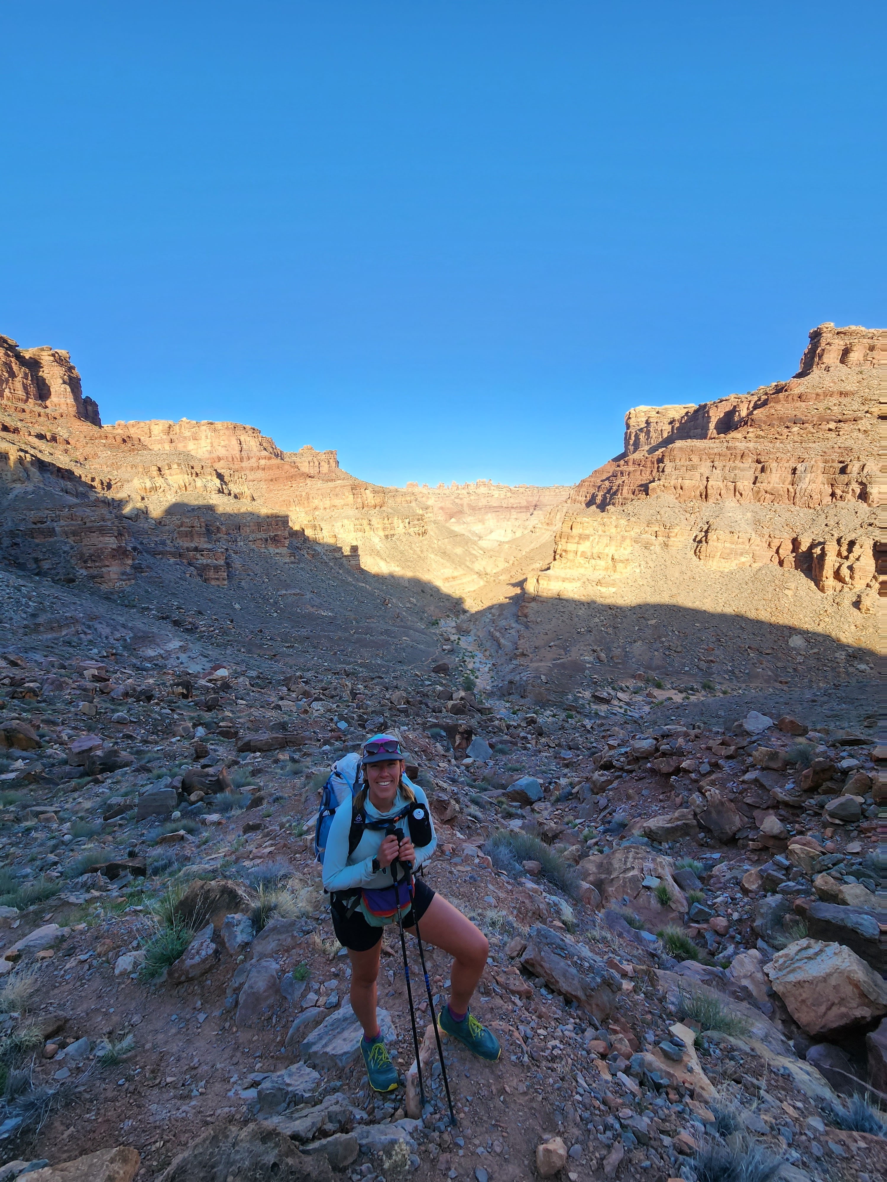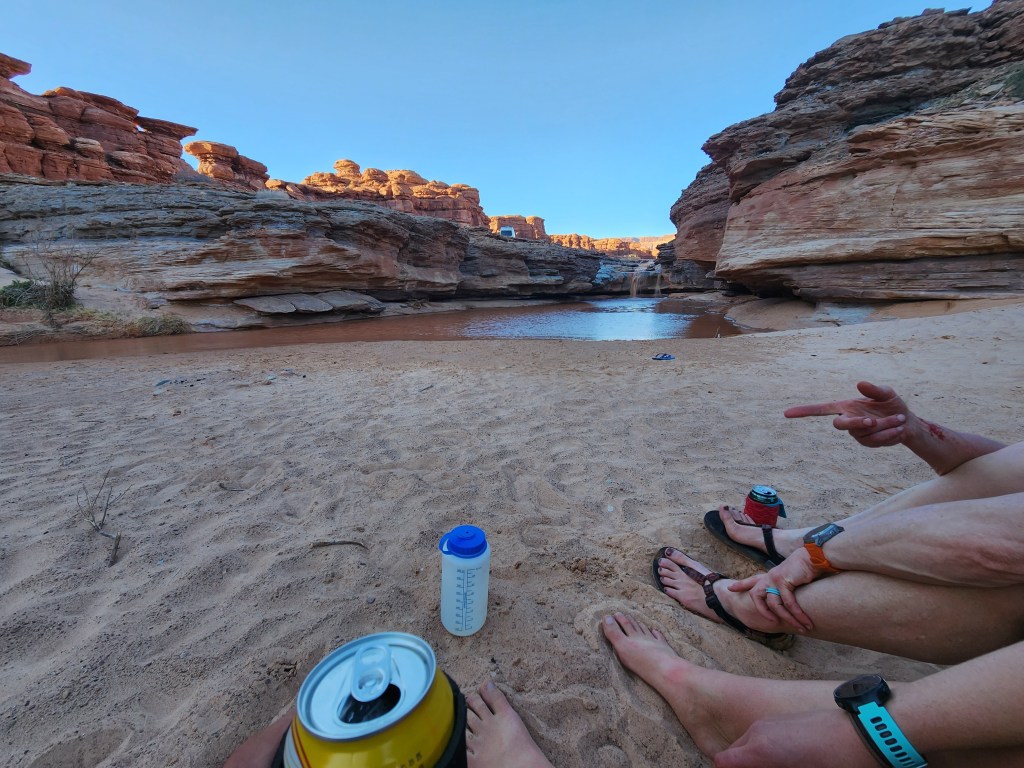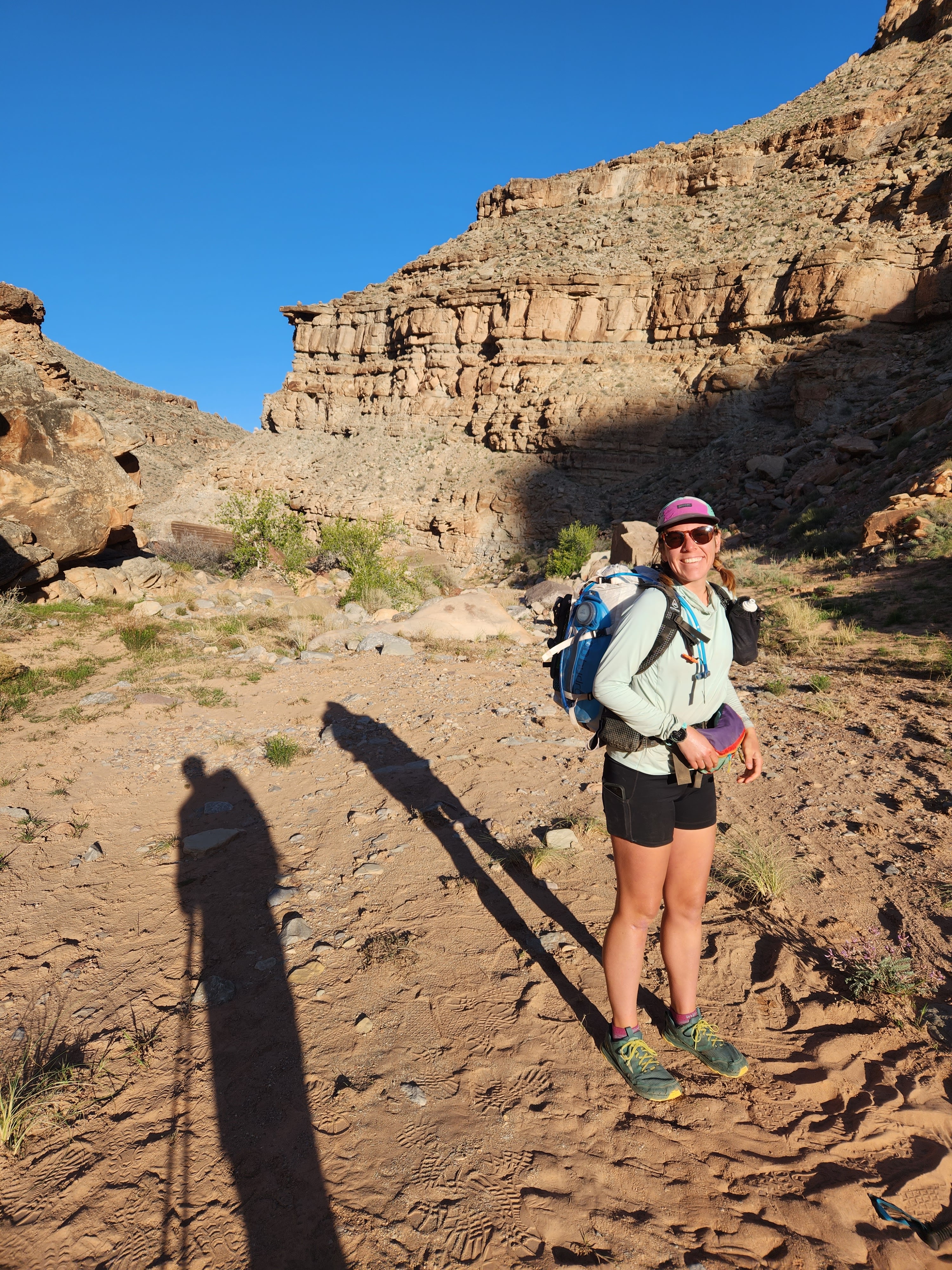 There was a small cove where our wash met the Colorado. After a hot day of hiking, I couldn’t resist jumping in. Maggie opted to watch as I took my shirt off and stepped into the squishy mud on the river banks. The water was cold – somewhere in the 40-50°F range, if I had to guess – but I love a good cold plunge! I tried my best to stay in and cool my core. Primal instinct took over at a certain point, and I leapt out of the water to warm up.