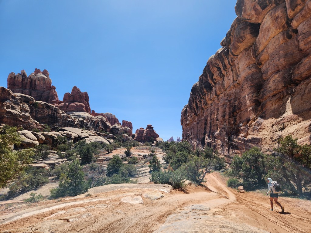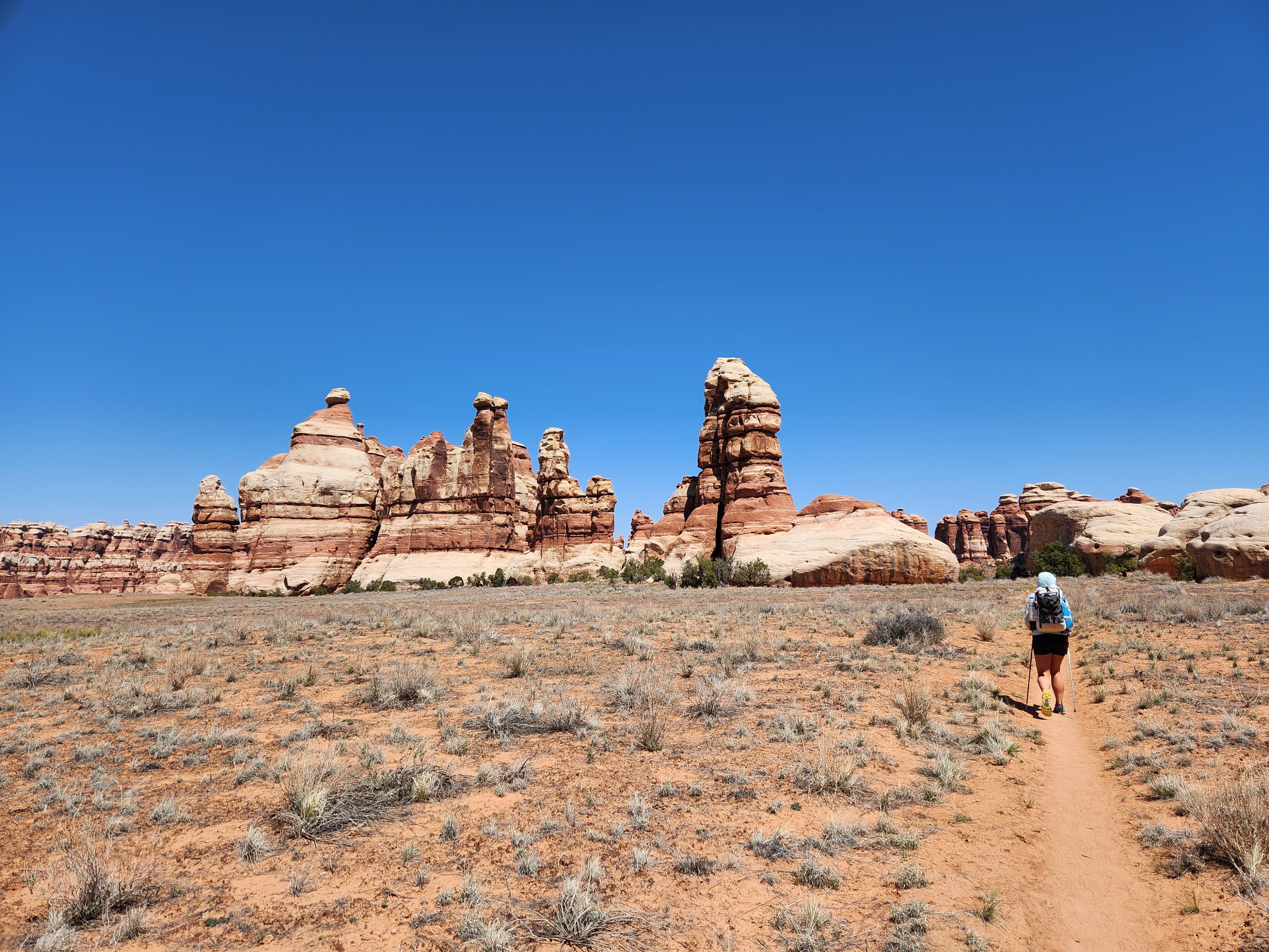 Having done most of the hikes in the National Parks, I was intent on finding fresh views with Maggie. I’ve come a long way from days of hiking 3-8 miles in jeans, so we were looking for something bigger. In my many hours of perusing satellite imagery, I had noticed an area in the Needles District that looked totally different from the surrounding geology. Rather than the snaking, lightning bolt style canyons that carry ephemeral creeks, there are a series of very wide and mostly straight depressions in the bedrock.