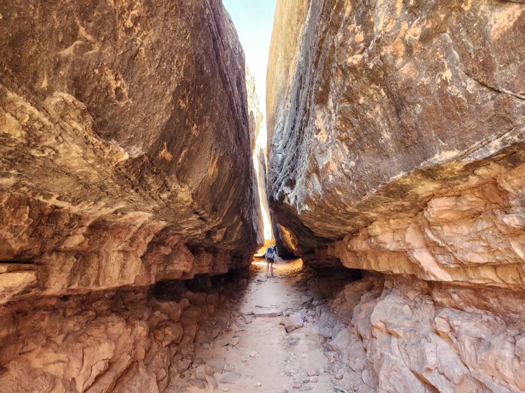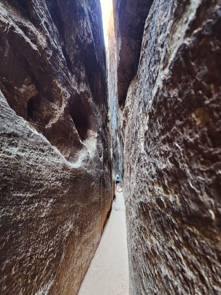 In an Indiana Jones moment, the sunlight was shining perfectly through the crack which went all the way through the sandstone ceiling. A group of hikers passed through a few minutes later and the sun beam had passed. They had no idea what they missed!