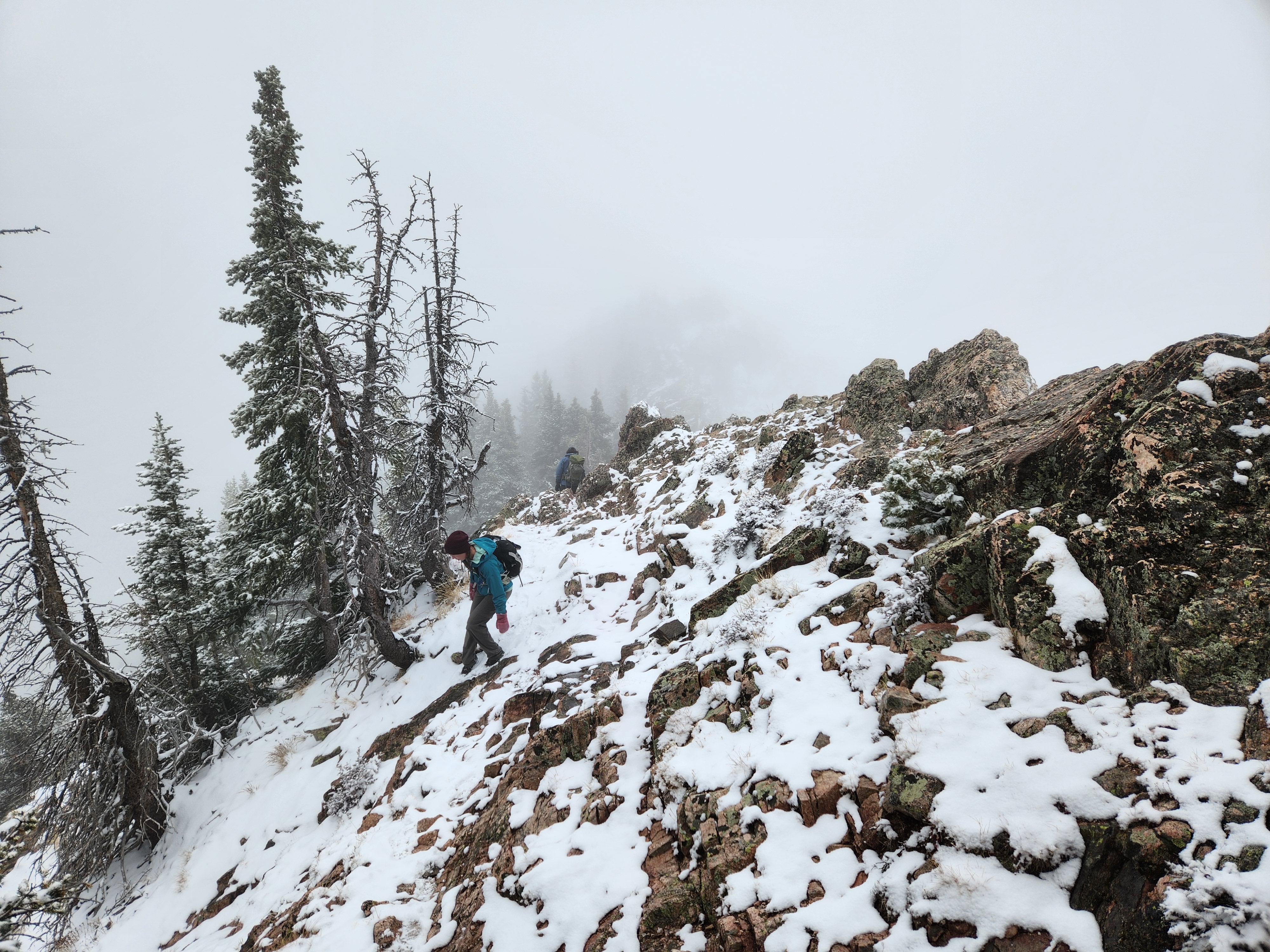 A couple weeks later, it looked like winter was finally coming, but only after 12pm or so. I went out with my friends, Ryan and Amber, to hike the standard route up Santa Fe Baldy. It was a crisp fall morning when we got started.