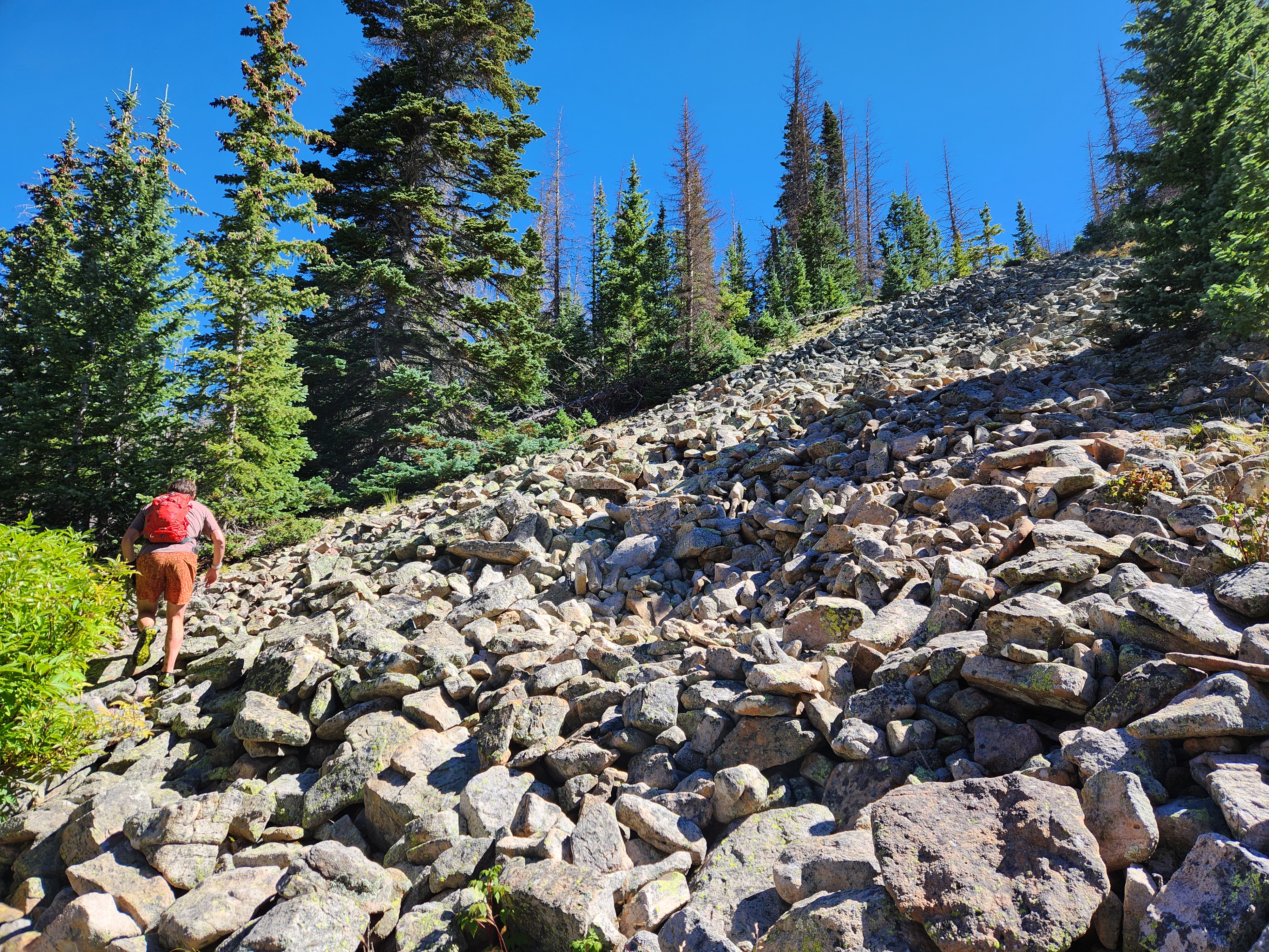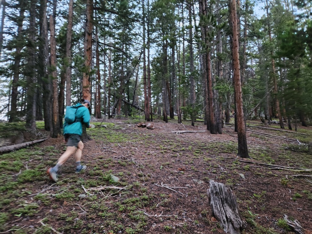I was awake at 3:45 am, forcing down a cold breakfast bar with hot tea. We were hiking up the Colorado Trail by 5:20 after a very civilized campground bathroom pit stop. It had been a while since I had started hiking before sunrise. Despite the darkness, it was invigorating to be setting off for a big day, especially at the brisk pace Ryan set. About a mile in, we turned off the Colorado Trail to start the off trail quest up Mt. Massive’s east ridge. The lodgepole pine forest was open and easily navigable.