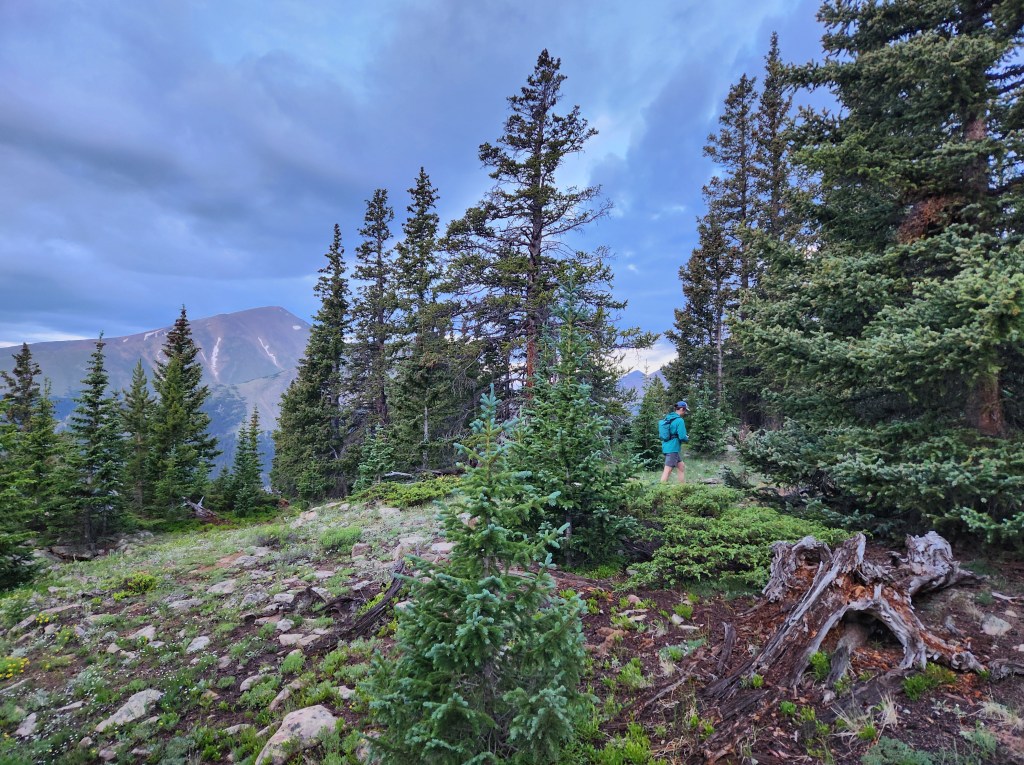 The sun rose, but not in any spectacular fashion. It was quite cloudy (rain was in the forecast later) so the dark only lifted to a dull gray with a brief orange glow behind us to the east. A moody Mt. Elbert provided some of the first views through the trees as we climbed.