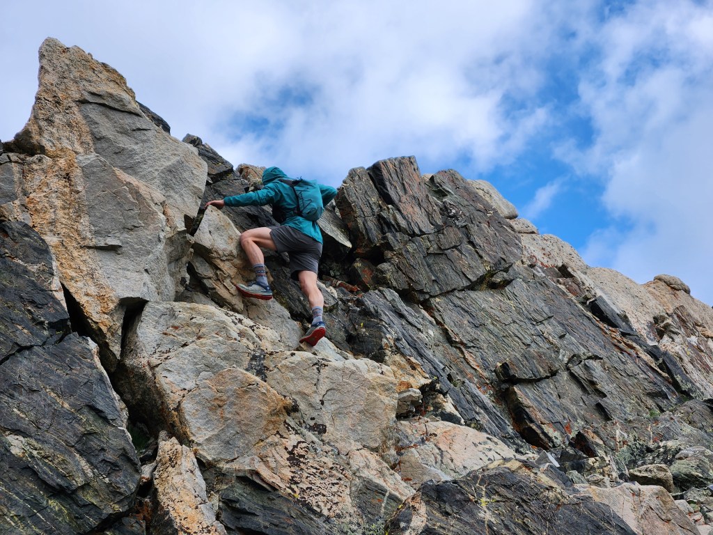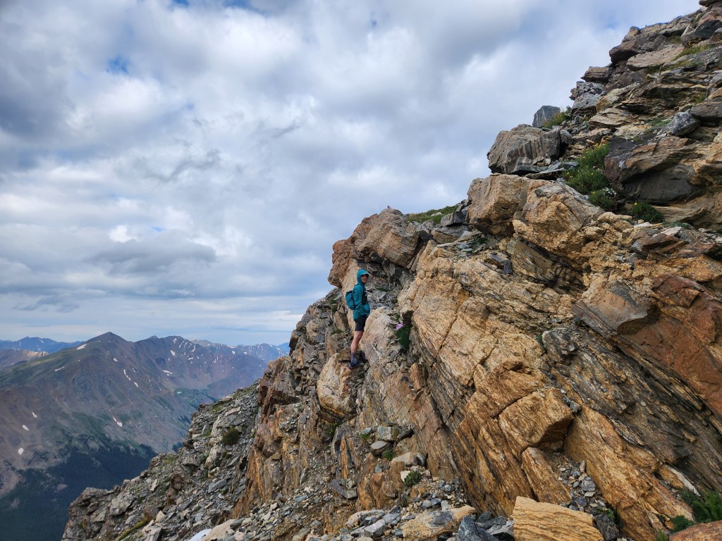Grassy tundra gave way to exposed rock and talus, which made for some fun easy scrambling as we climbed higher. We finally hit 14,000 on Massive South-East, a rocky block with a clear view to our main objective. A chilly, damp wind necessitated donning a fleece layer to stay warm.