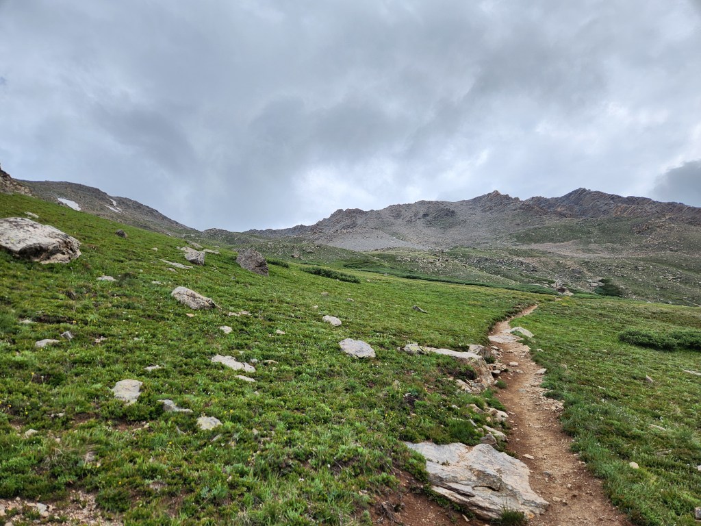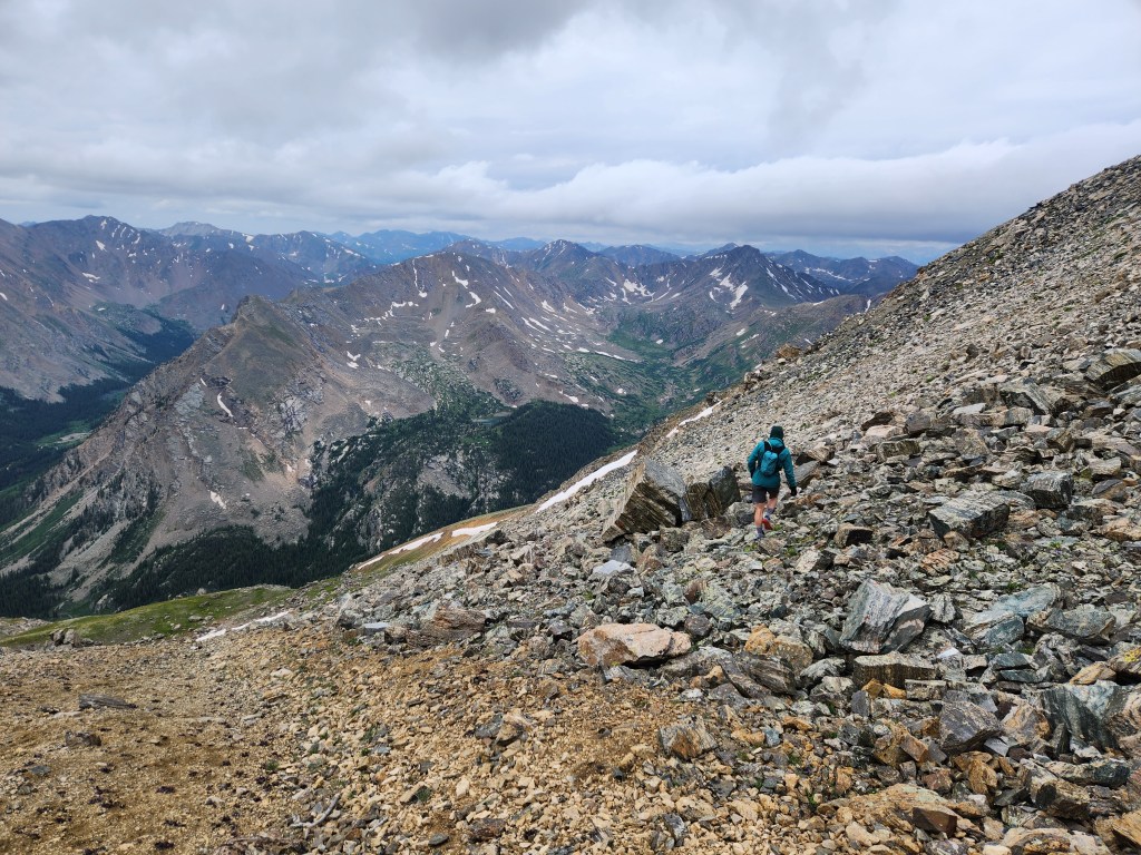 Ryan and I had planned on continuing north west over Mt. Massive’s ridge line, but the clouds looked rather threatening. Our planned descent would be off trail down steep slopes, so the last thing we wanted was to be stuck in a white out and rain while route finding down the mountain. Feeling successful with tagging the true summit, we retreated down the standard south slopes trail.