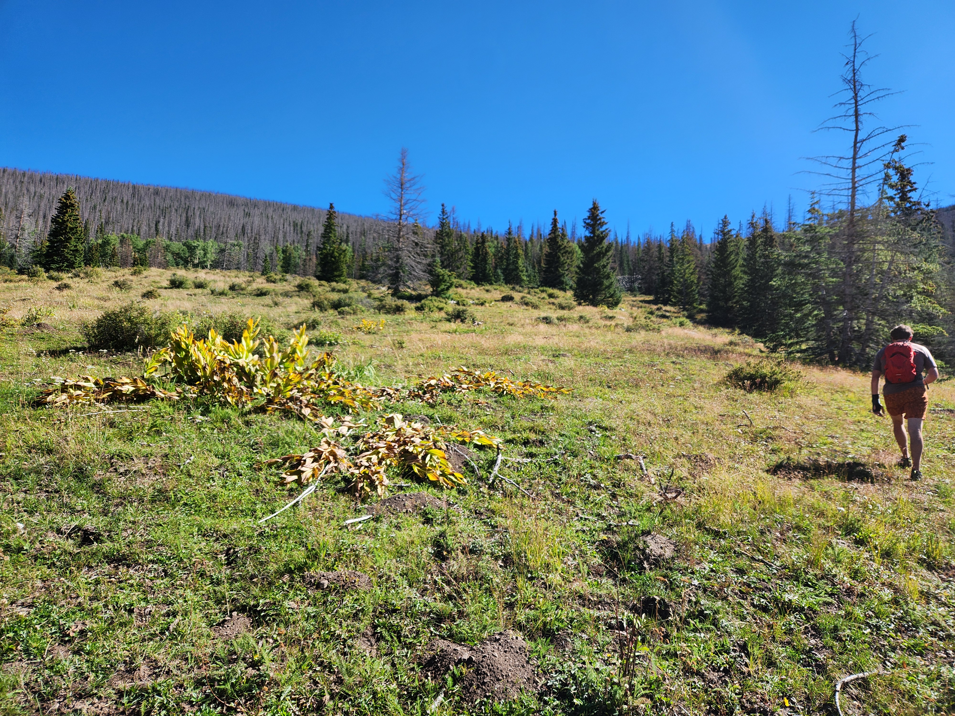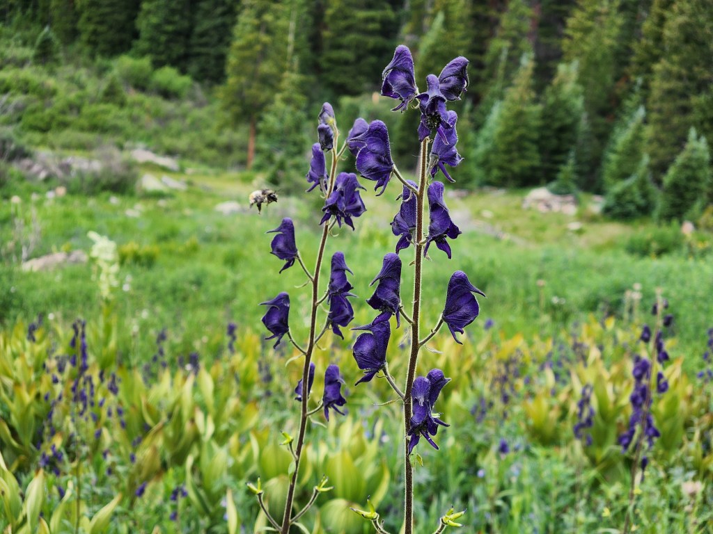 Other than missing the south slopes trail turn off and cutting across said slopes to get back on track, the descent was uneventful, though very pretty. It felt like we were in the heart of the Sawatch Mountains. Lower down, the wildflowers were popping off. A vigorous population of monkshood had taken over a stretch of the creek side, along with many other botanical friends.