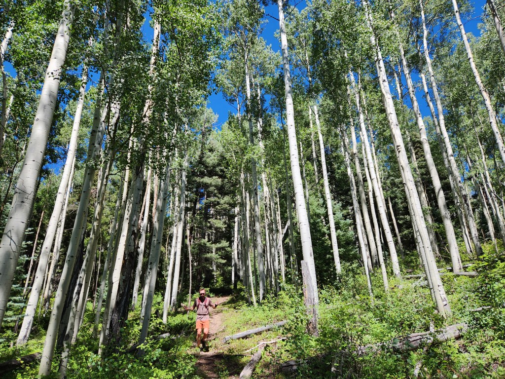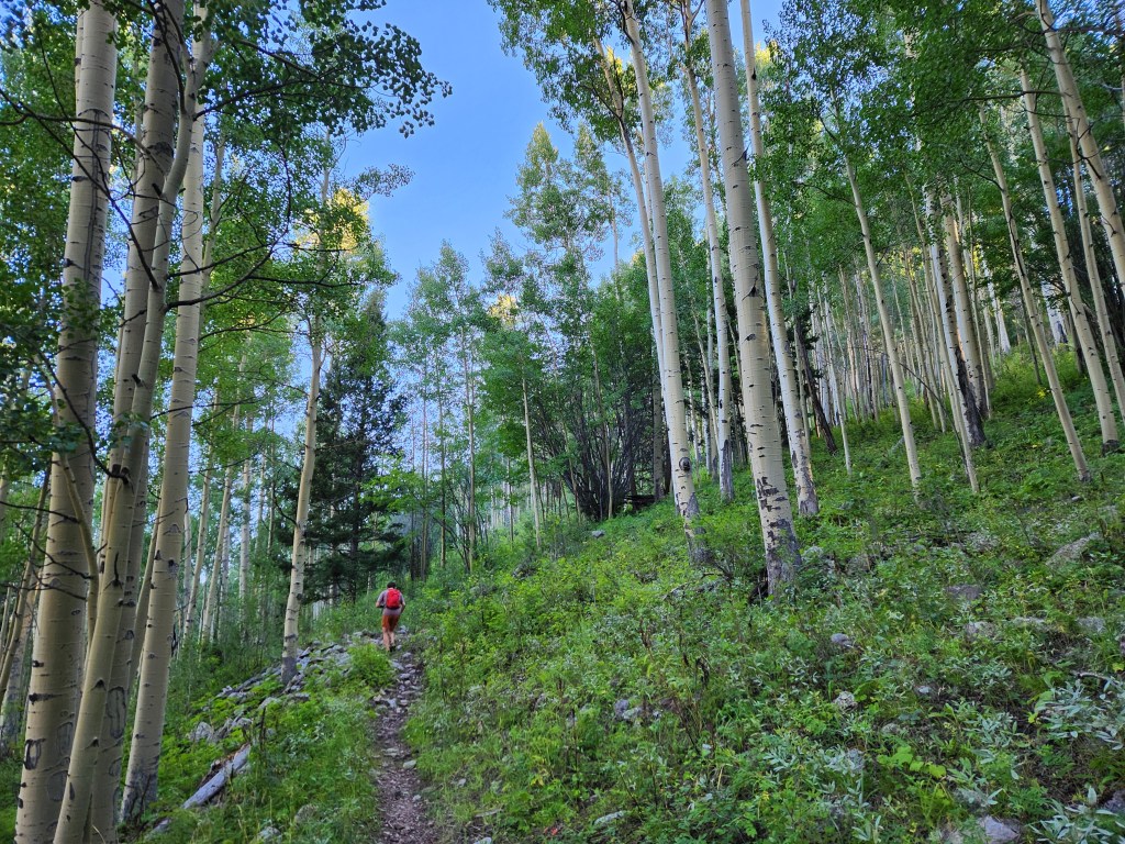 After a few miles, we started climbing in earnest out of the Santa Barbara valley, switch backing through quaking aspens and cow patties. Matt and I had to herd a heifer and three calves for a few minutes, which was annoying but Matt’s colorful commentary made it entertaining for me.