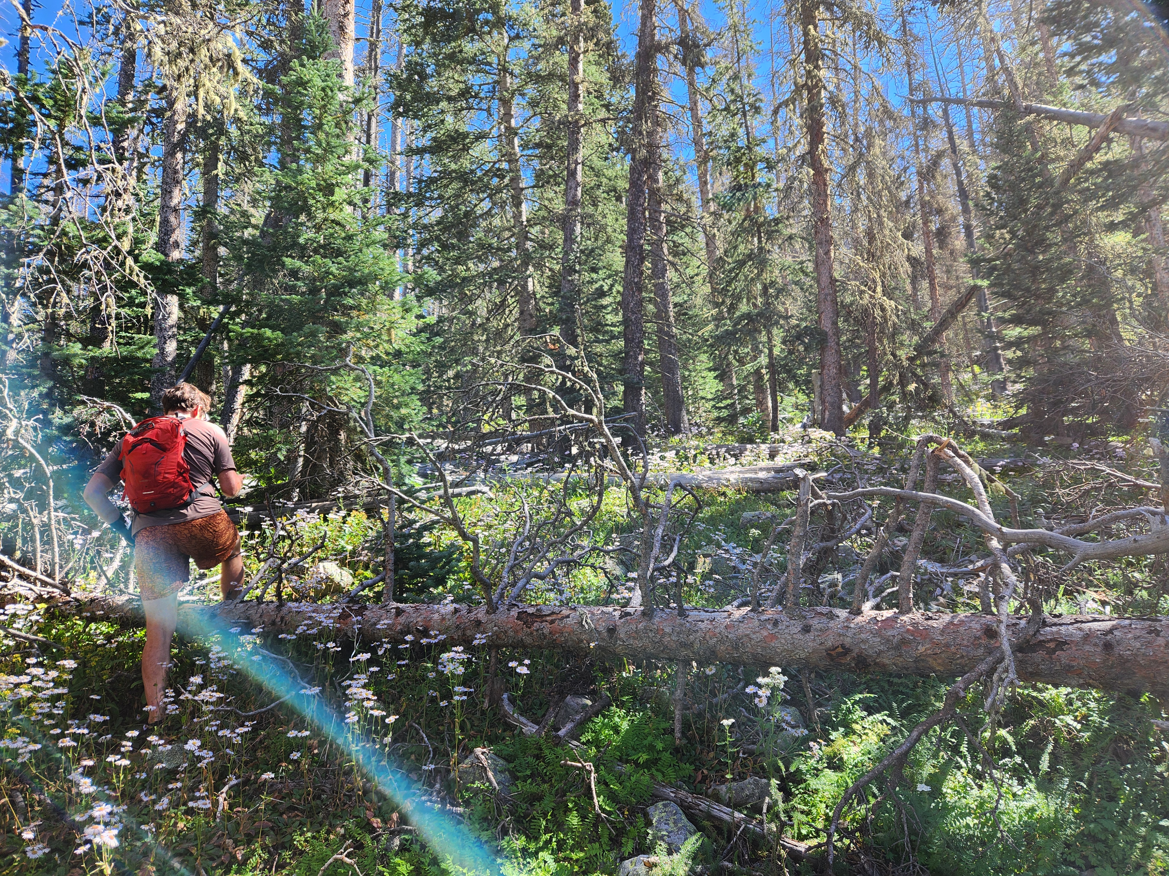 The trees opened up and the trail faded into and alpine meadow. Back in the spruce forest, we could follow a faint trail here and there, but it was littered with beetle kill blow down. Only the most popular trails in New Mexico stay somewhat maintained. I came in expecting this to some degree. The nice thing about the Rocky Mountains is that the bushwhacking is never that bad. Meandering up our own trail, the path of least resistance, Matt and I made it to tree line without too much trouble.