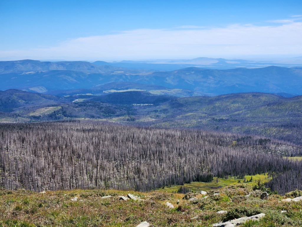 At the first saddle, I made sure to get a view to the east. The Hermit’s Peak-Calf Canyon fire had rolled through two years prior. It was one of the biggest fires in New Mexico history, started as a prescribed burn that got out of control. I was a little surprised to see handfuls of live trees amongst the charred bones of a former forest. Life finds a way.