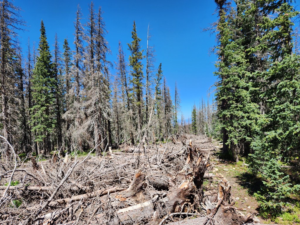 After a quick break we were heading down the north side of the mountain. I was back in familiar terrain and knew precisely where to go and what to expect. A long ridge traverse took us back to the woods where we found something I did not expect. A pile of dead trees stretching ahead of us like some sick unfinished highway. We deduced that it must have been a fire break for the HPCC fire. The fire never made it up this ridge so we were left with this eye sore.