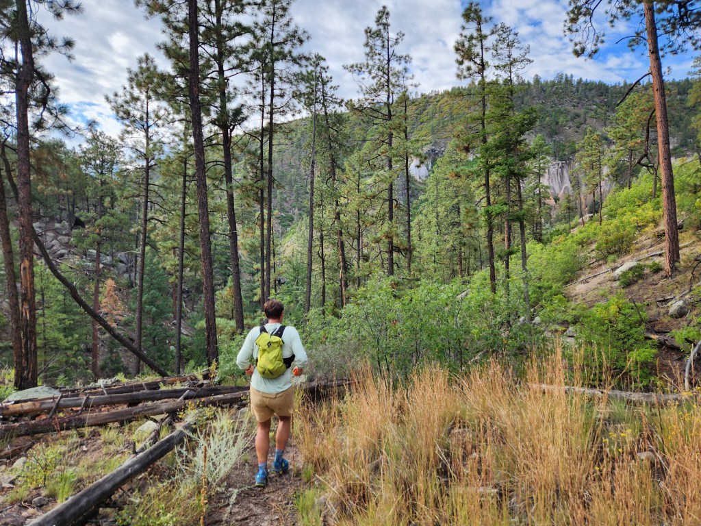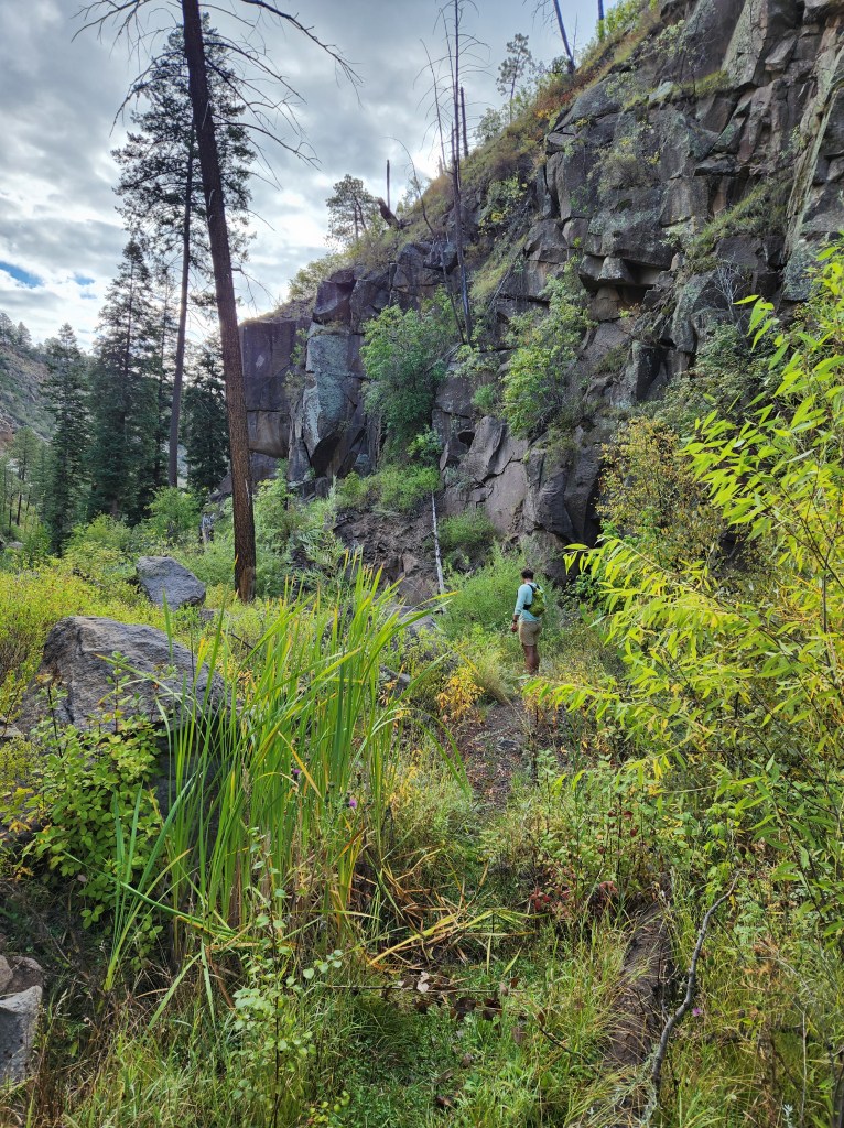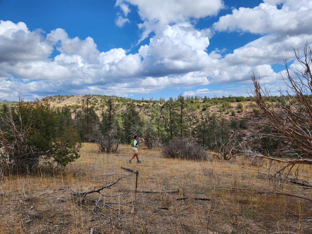 Meandering through the juniper woodlands, Tony and I maintained a steady 12 min/mile pace. Across the first mesa, we descended into the upper section of Alamo Canyon. Summer of 2024 had been a great monsoon season. While it certainly seemed like flash floods had created some disturbance in the canyon, the plant life was otherwise thriving. It’s always a treat to find such lush and vibrant microcosms in the desert. Life, uh, finds a way.