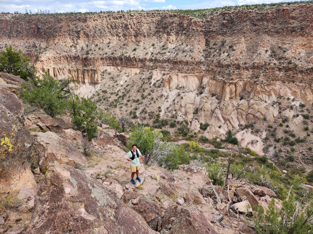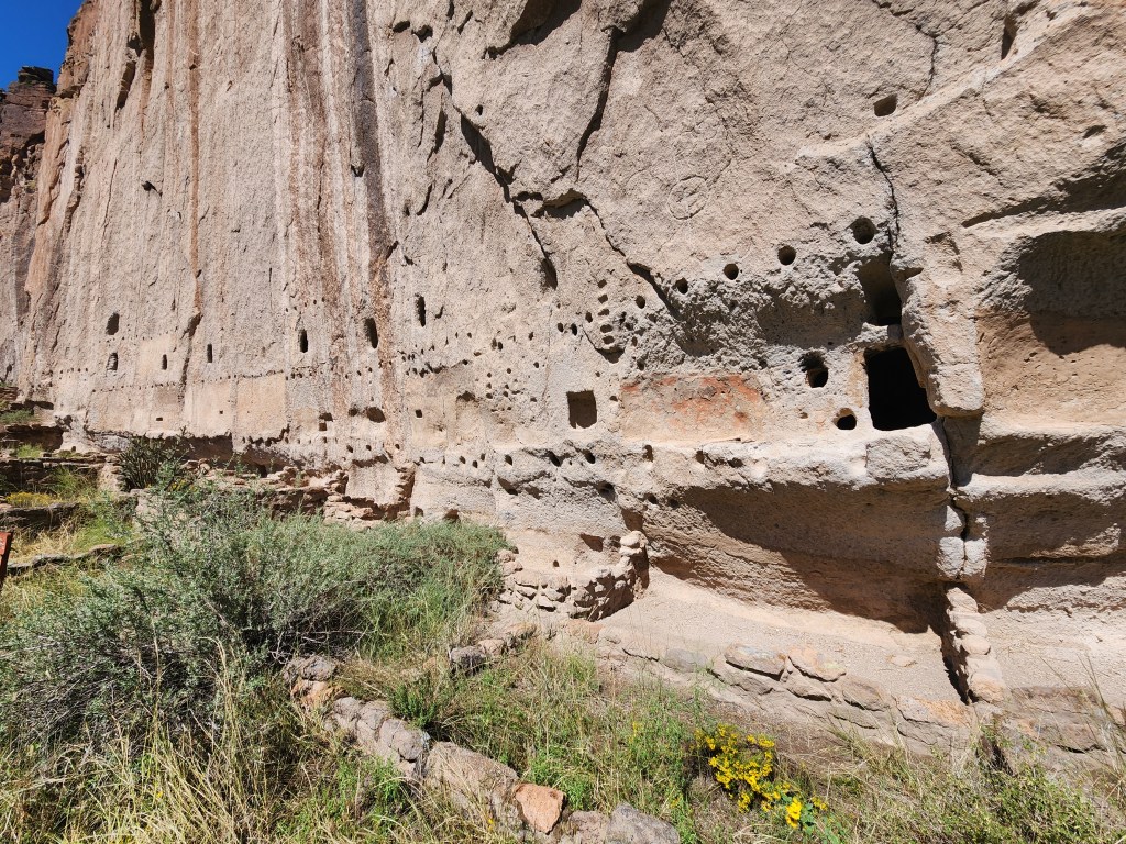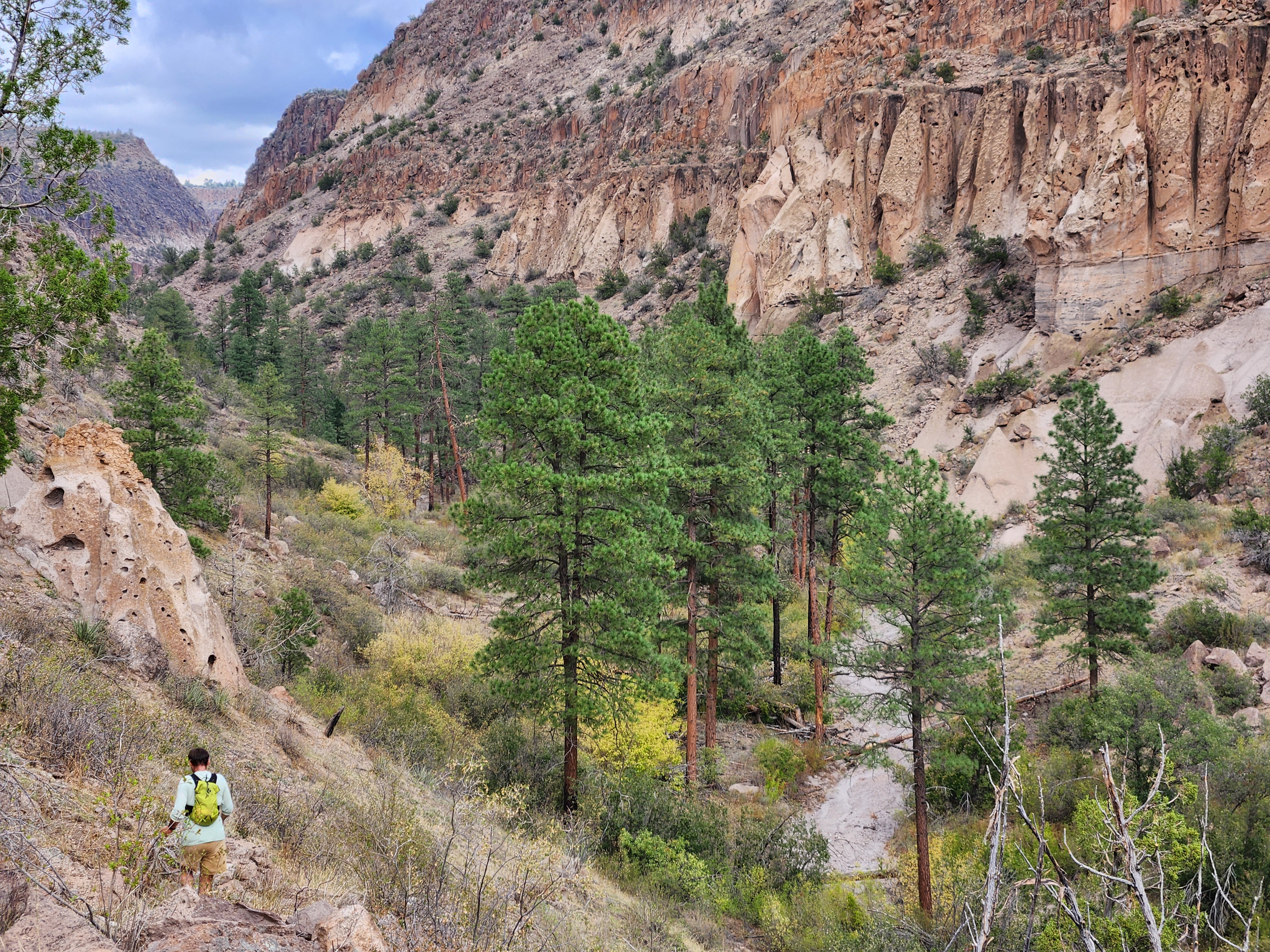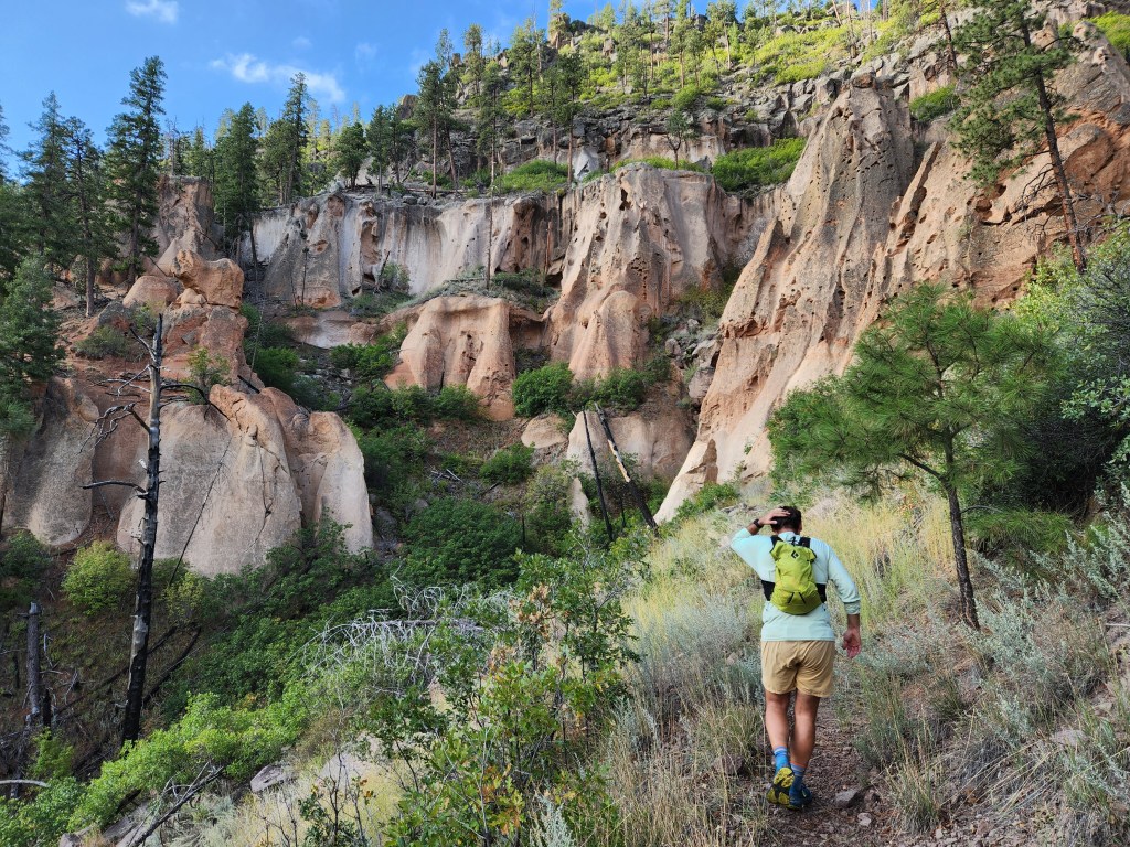 We were on the flanks of the Jemez Mountains, which were formed by multiple eruptions from a super volcano. Pyroclastic flows blanketed the land in hundreds of feet volcanic ash, which settled and solidified into the Bandelier tuff about 1.5 million years ago. After this cataclysm, water eroded a series of canyons leading towards the Rio Grande. Despite its name, this tuff is quite soft. The first humans here carved cliff dwellings into the walls of the canyons, in addition to constructing a large pueblo and numerous other structures. Here we were, slowly running up the side of Frijoles Canyon, a population center for many peoples spanning over 1,000 years.
