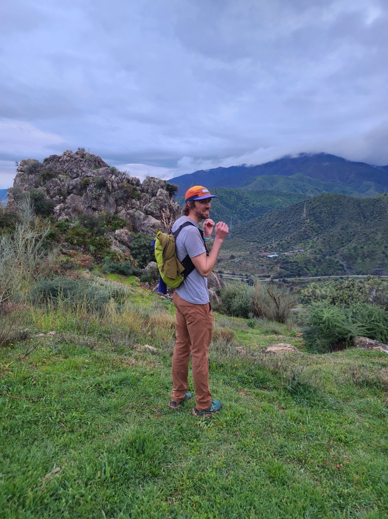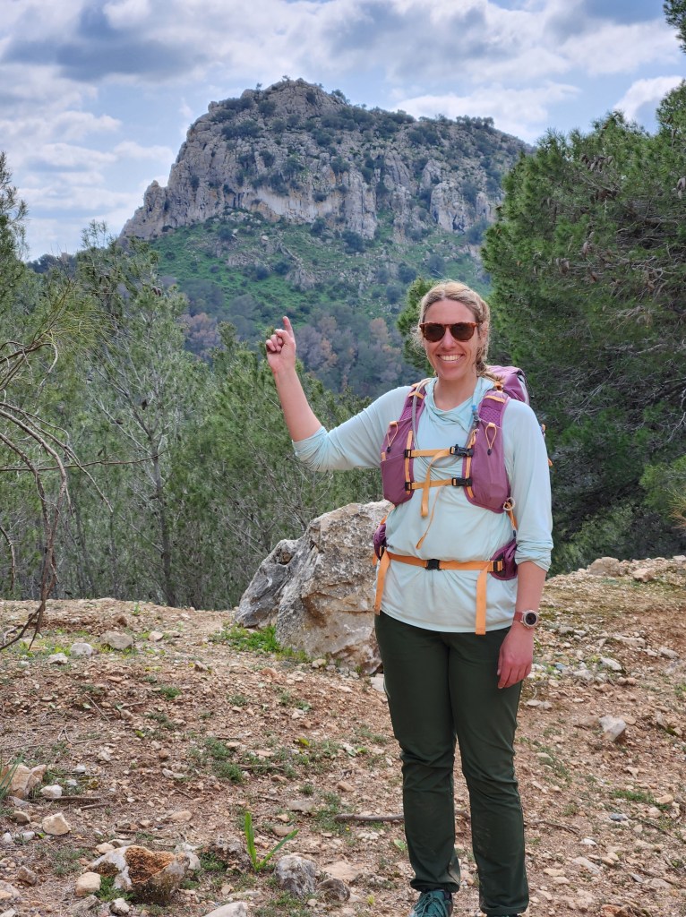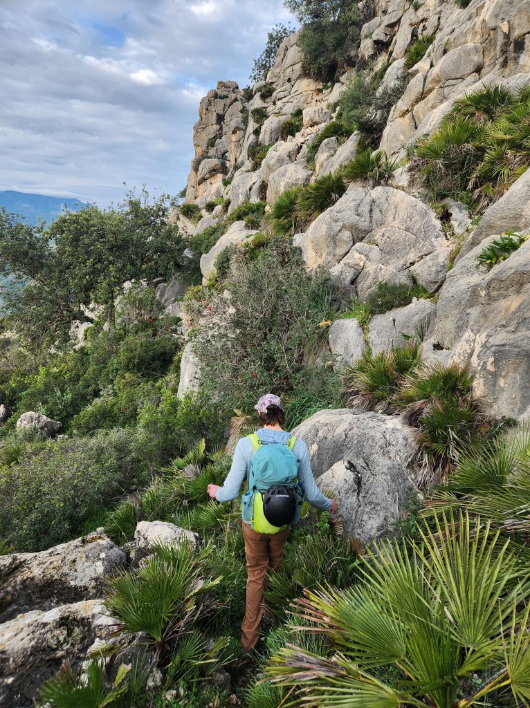 We retreated to the trail and took the long way, an extra 2 miles around the back side of our little mountain. Luckily, Maggie and I enjoy hiking. We did worry about wasting too much time on the approach, but taking the extra time seemed to work out for the best. The clouds began to part by the time we found the start of the route. The rock was a little damp, but the Spanish sun was quickly drying things out. Schlepping all this gear to El Chorro was starting to feel worthwhile.