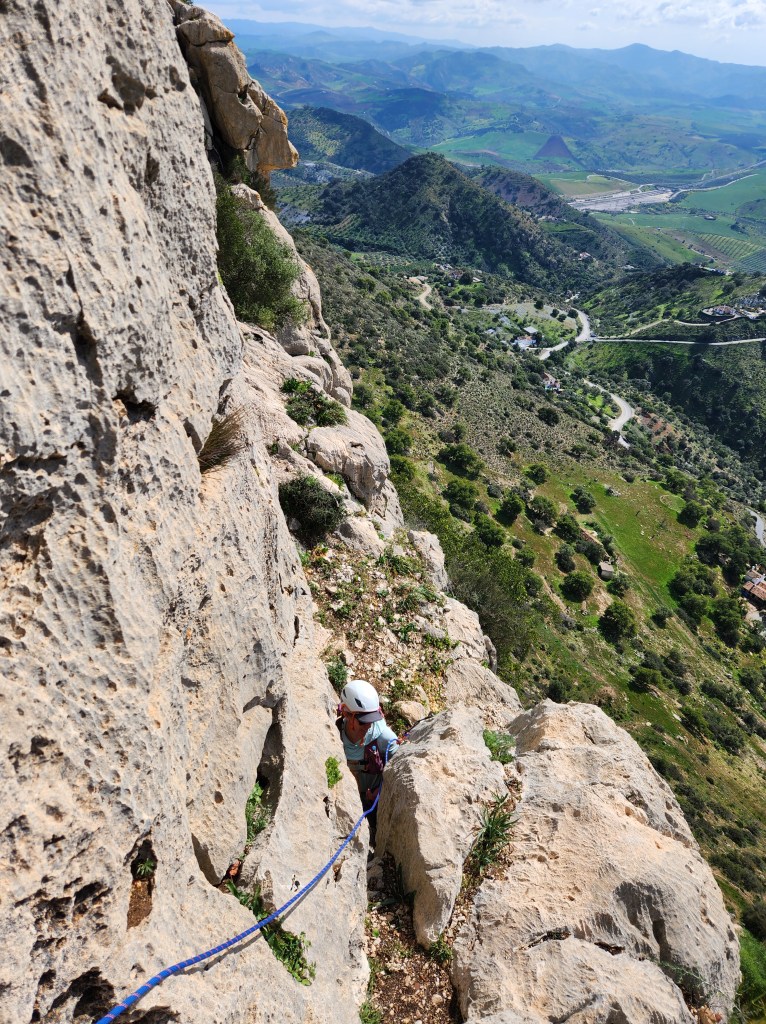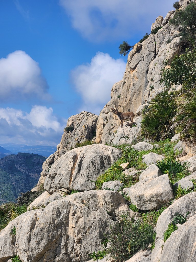 We were hearing and seeing animals above and below as we climbed higher. A sizable number of sheep in the farms around the mountain were bleating all morning. A steady “baaaah” could be heard for most of the climb. Around pitch two, a small herd of Iberian ibex galloped down the face we were climbing. A male ibex with large horns paused to keep an eye on us as we entered his home. It felt funny to be roped up next to these cliff dwellers as they were leaping up and down the same terrain with ease.