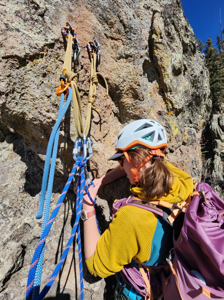 The descent started off with some easy scrambling down the back side. We reached a cliff and found the rappel anchors without too much trouble. Other than getting a little tangled in a snag, our 60 meter rope was perfect for the rap.