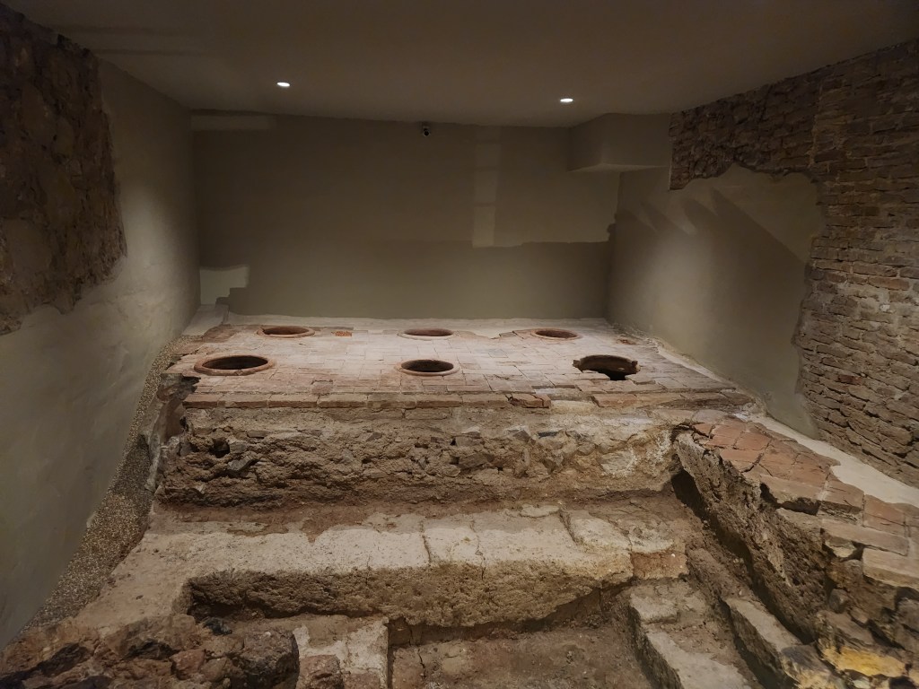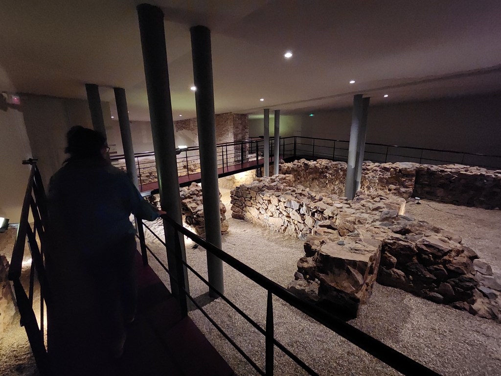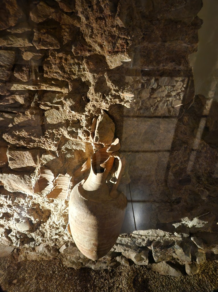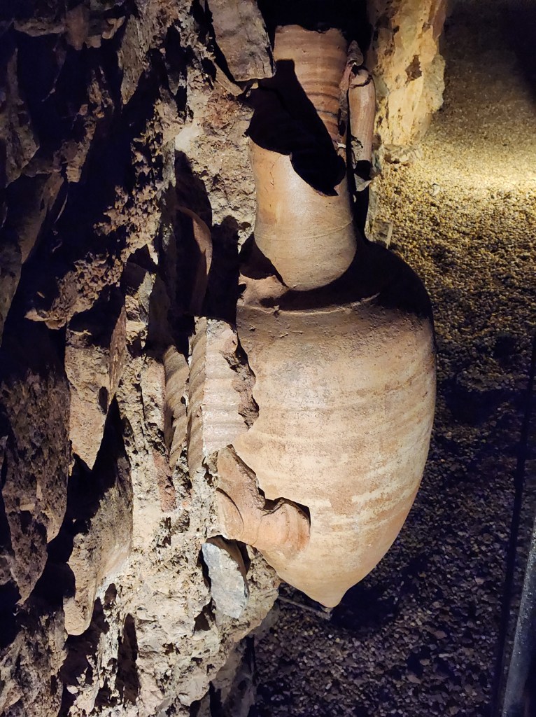 Wandering the halls, Maggie and I spotted a door with a small sign saying something like “Archeology Area”. Curiosity got the better of us, and we went down the stairs into the dim, musty basement. Sure enough, there were Roman and Phoenician structures underneath the museum. Amongst the walls was an amphora sticking out, mostly intact. This was a pleasant surprise to stumble upon!