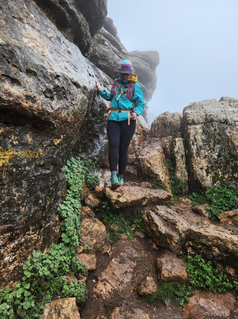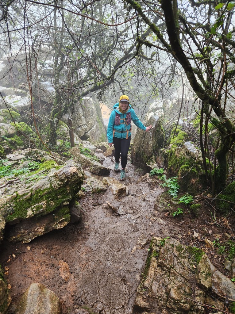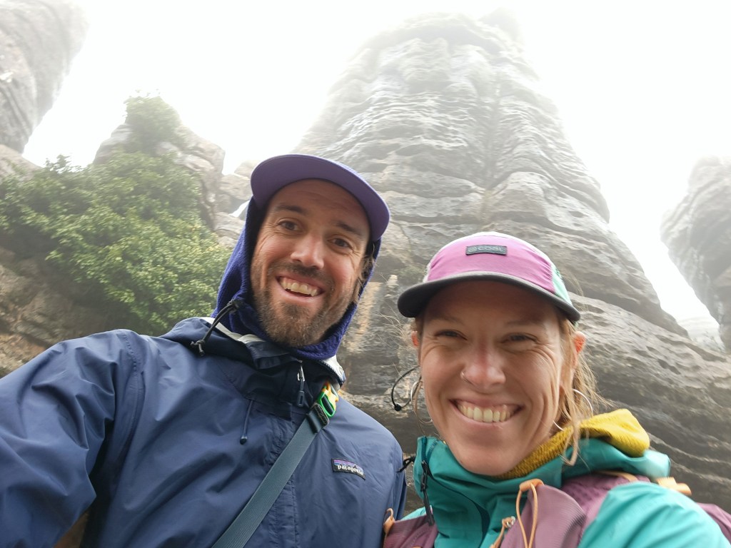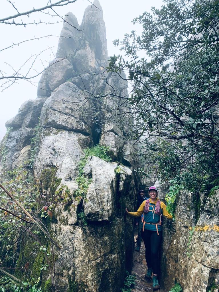 The mist was heavy, the drizzle was light. Under the circumstances, our trail was dissolving into some of the stickiest and slick mud I have ever experienced. Limestone becomes very slippery when wet, especially with a thin veneer of mud tracked around by hikers. There were small ups and downs along the trail, which often required using your hands to avoid taking a spill. While the mud was a bit of nuisance, I think the vibe created by the mist was ethereal and mysterious. It felt like we were exploring another planet. We certainly didn’t have any bearings with the low visibility, often feeling lost in a maze of boulders and spires.