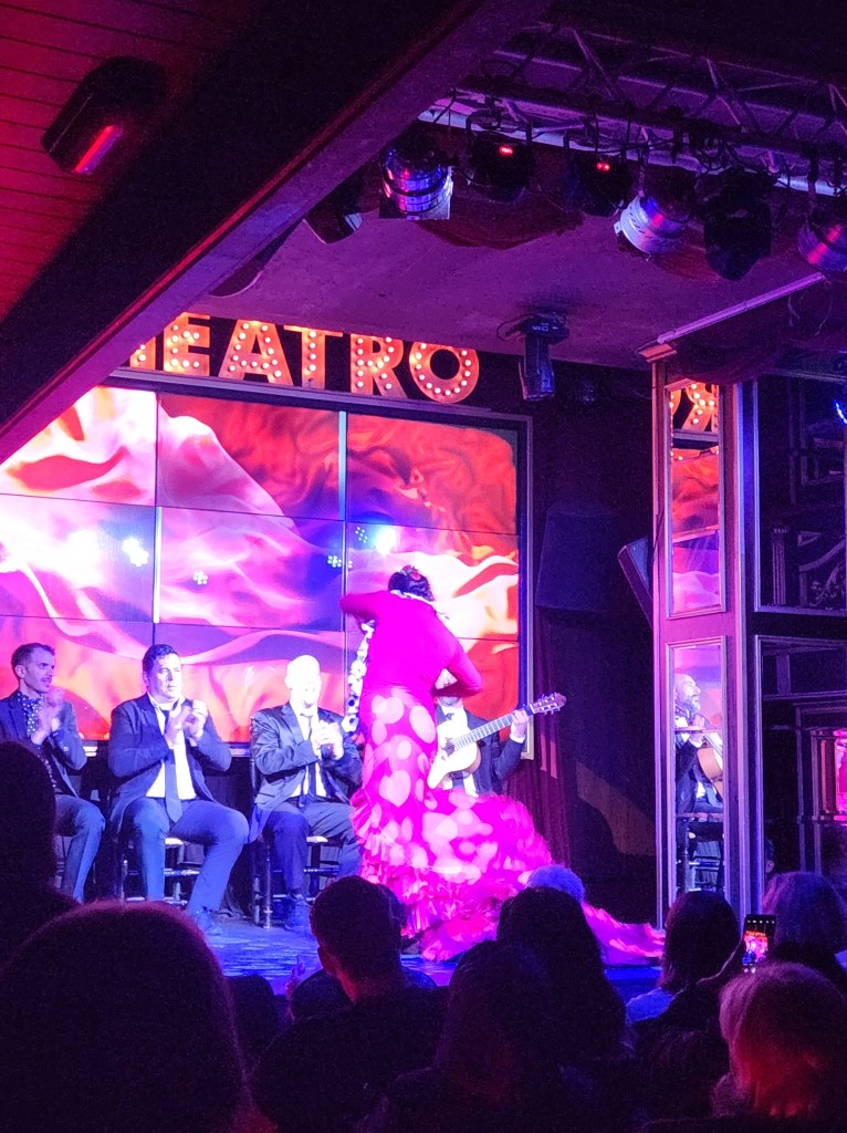 We returned to Málaga for dinner and a show. Kristen and Jake recommended that we go to a Flamenco performance, so they got tickets for us and the whole family. Southern Spain is where was Flamenco was born, but its roots come from a mix of cultures, including India, Arabia, and North Africa, where the styles and traditions blended on the Iberian Peninsula. The lot of us squeezed into a corner booth in the little theater just before they dimmed the lights.