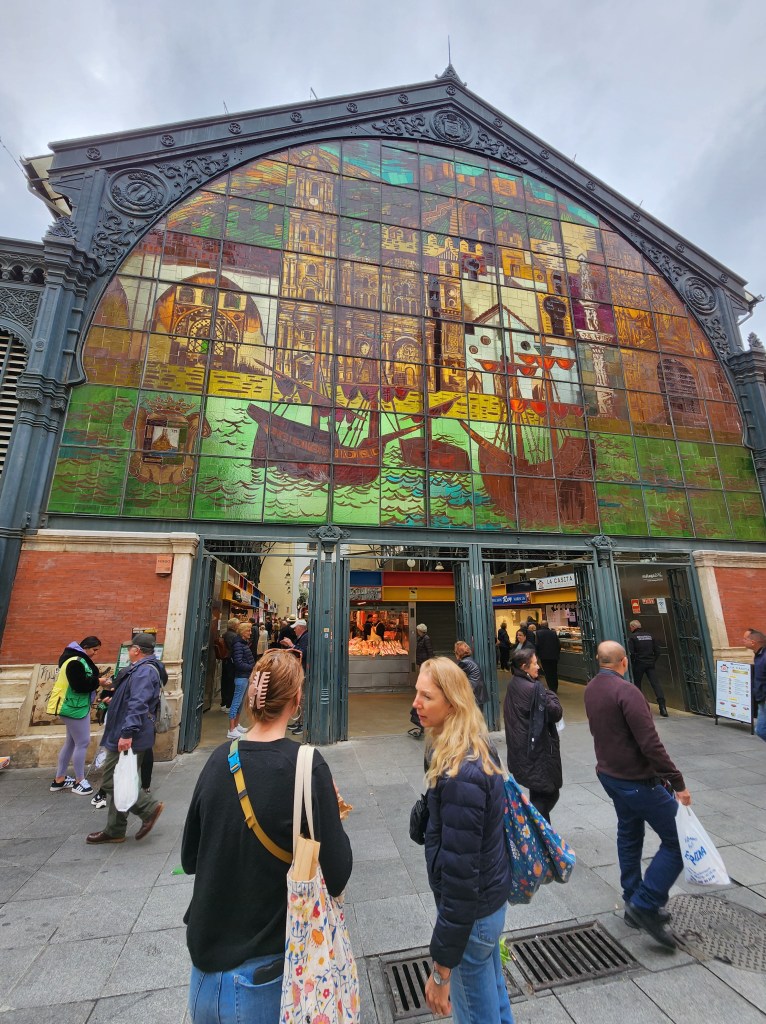 Maggie and I spent the day milling around Málaga with Kristen. When it comes to food, Kristen does not leave anything to chance. Since we had arrived, Kristen and Jake had been raving about how easy it is to get fresh, high quality groceries in Spain. This was made possible by the markets. For my American readers, try for a moment to forget everything you know about the “super market”. We rode bikes to the centro district to stop in the Mercado Central. Rather than a large neon sign with the name of super market, the facade was a sweeping scene in stained glass.