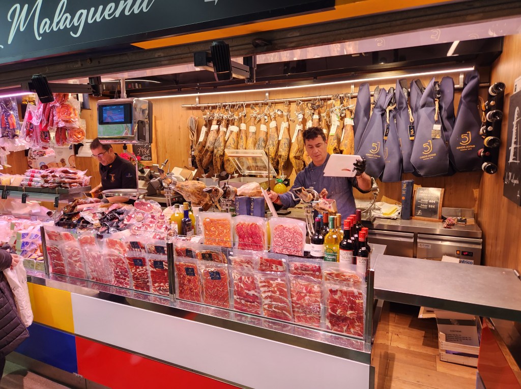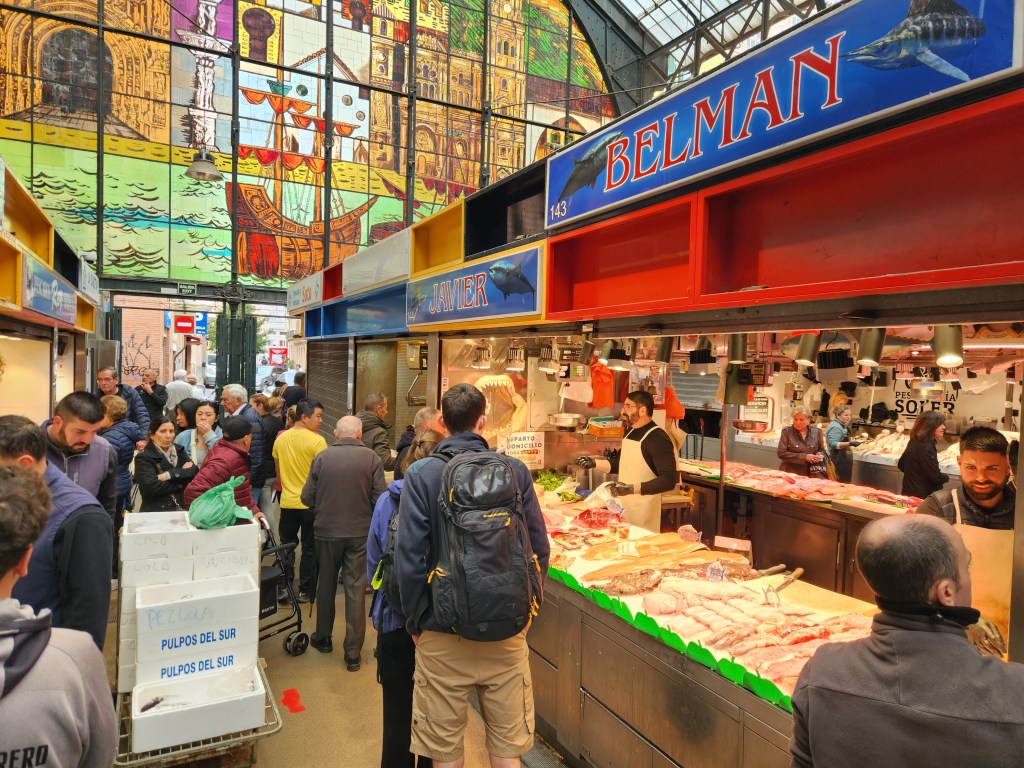 Walking around the city, we had seen several shops selling Iberian ham. Here at the market we got to see it up close and personal. There are tight rules around producing Iberian ham. It carries a dominion of origin, much like how tequila can only be made from blue agave in southern Mexico. Iberian black pigs are raised and finished by feeding on chestnuts and acorns, making the meat fatty and marbled. The hams are salted and hung to cure for at least a year, sometimes up to four years. At the market, the ham is placed on a stainless steel stand and secured by several screws. Thin slices are delicately removed one at a time. You can buy sealed packages, or fresh cut servings, typically only 25-50 grams (1-2 ounces) for $10-20. A whole ham costs upwards of $500-1,000! Kristen got 25g to treat Jake and the kids.