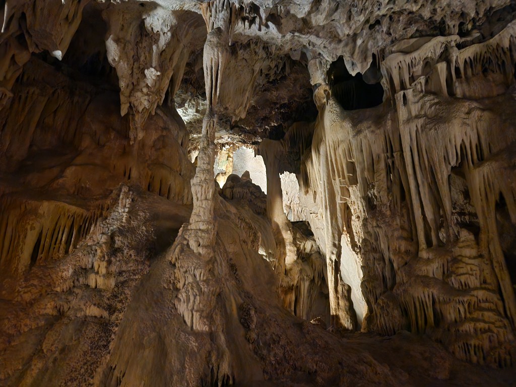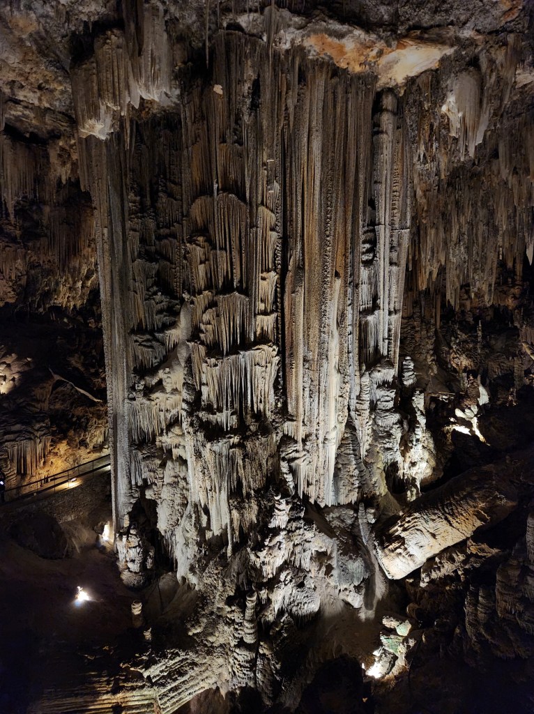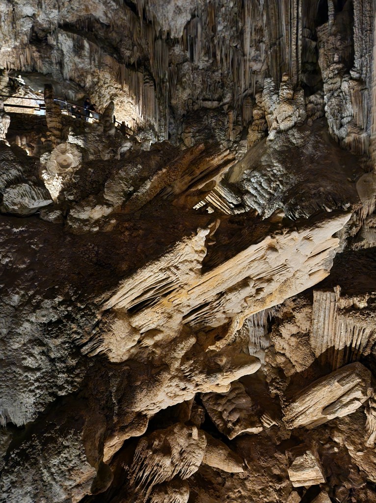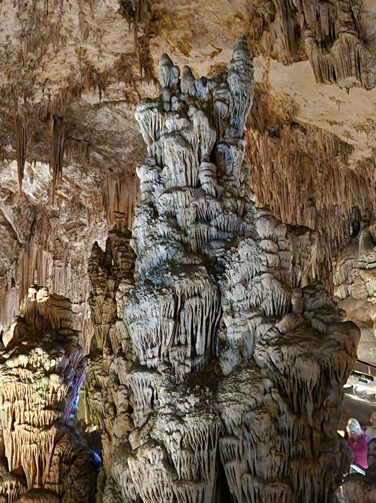 The path curved around to a larger room, where an absolutely massive column stood in the center, perhaps 50 feet across and 100 feet tall. I’ve done some cave tours in my day and I’ve never seen anything like this column. Usually cave formations are straight up and down, water following gravity and moving minerals around. In the big room there were some toppled stalagmites and formations sitting at rakish angles. Turns out an earthquake hit the region about 800,000 years ago. I can’t think of a scarier place to be during an earthquake!