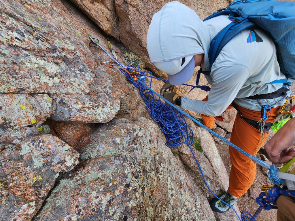 The rest of the pitch flew by. I was feeling confident, but the rope drag caught up to me. There was an inviting belay ledge where I radioed to Ryan. “Ok.. you have a lot of rope left,” he replied. I didn’t care, there was no way I was going to continue up with 30+ pounds of drag. I built an anchor, which I’m a little embarrassed to admit was my first 3-piece anchor to be used for a belay station in the wild. As I was belaying, I noticed the nut in the middle was wiggling around a bit. Definitely not a great placement, but I felt good about the other two legs.