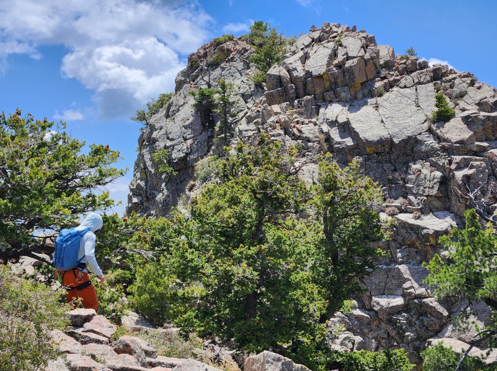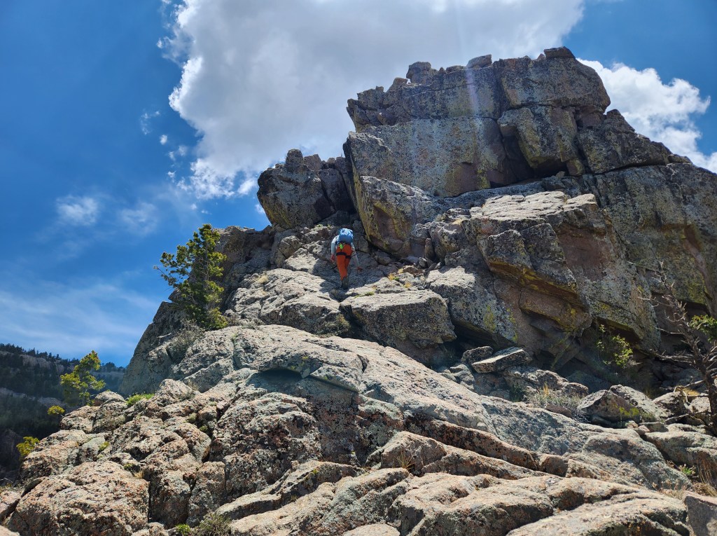 There was one section of 4th class terrain which brought us to the edge of the cliff. Ryan and I stopped for a moment to talk it through. Even though the moves looked doable, one slip would mean falling down into the canyon below. I went first. To say I was being careful would be an understatement. Every move was made only when I was absolutely certain my hands and feet were solid. This was definitely the mental crux.