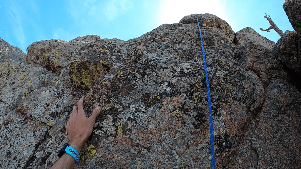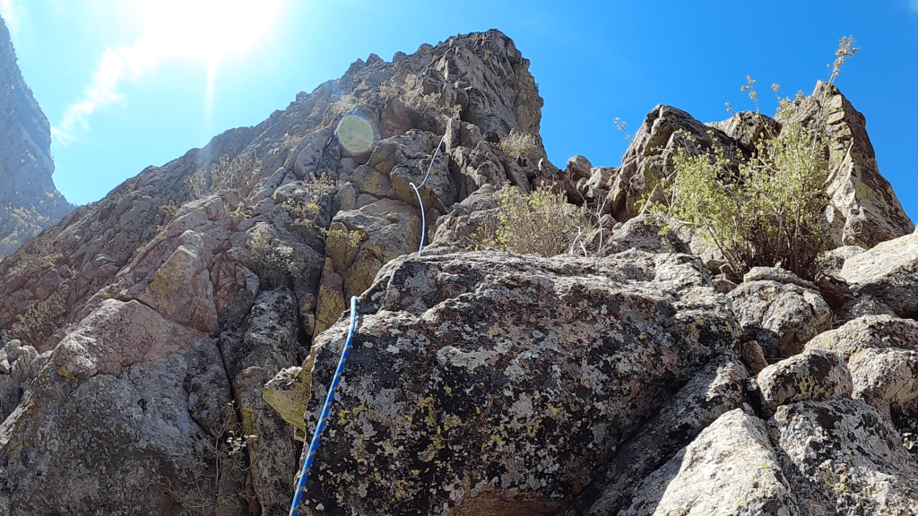 We found the start of the route pretty easily, aided by Ryan’s distant memory from his last attempt. Ryan took the lead for pitch 1, starting up some steep, blocky climbing. He went out of sight soon after since the ridge is less than vertical. The average slope is about 60°. I’m learning that these lower angle 5th class climbs are more like a staircase than a ramp – short shots of vertical climbing with easy scrambling in between.