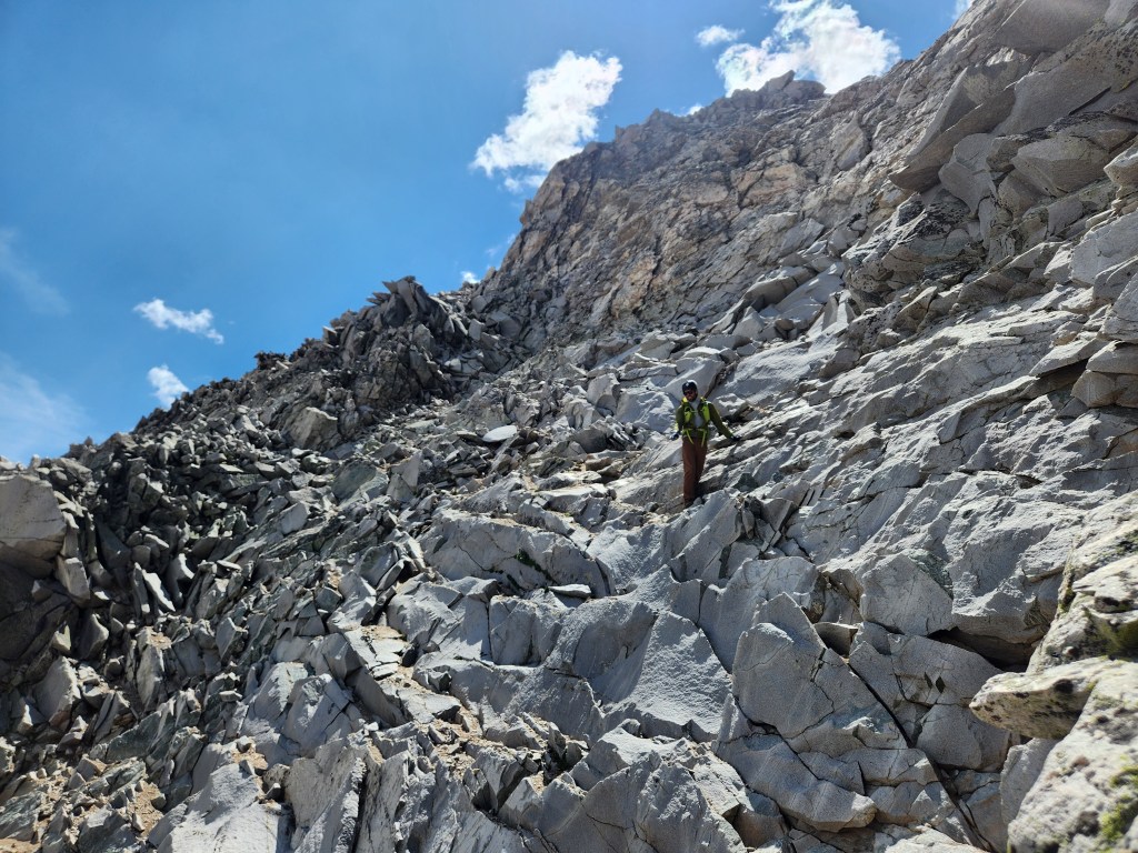 Wrong. While the terrain certainly didn’t warrant a rope, the way down was continuous no fall zone. There was still plenty of loose rock. Covering ground was just so slow, carefully picking our way through steep blocks and ledges. I put on a smile for the camera, but I must confess I was not having a good time. I was in a mental purgatory, fending off consistent primal fear and simply focusing on the next move in front of me. The cumulative exposure and constant need to focus was taking a toll.