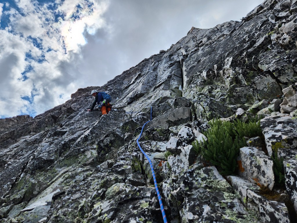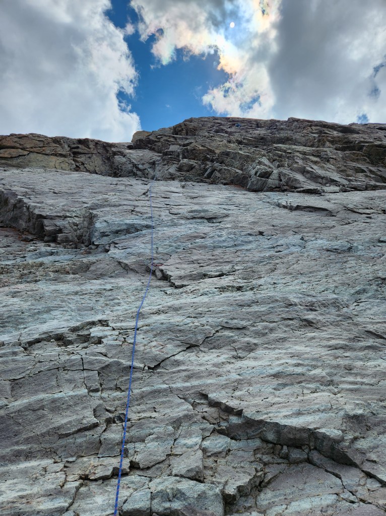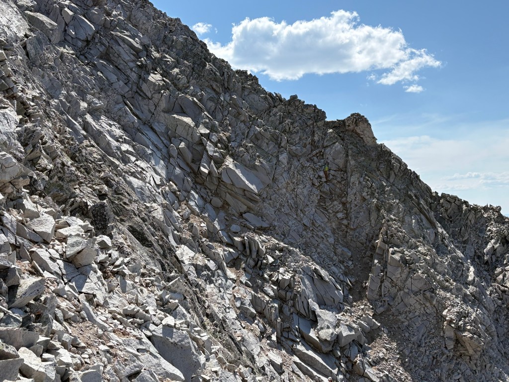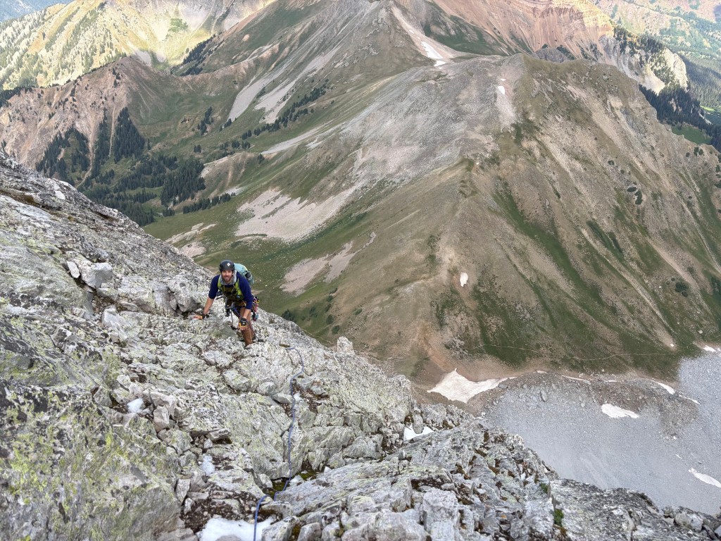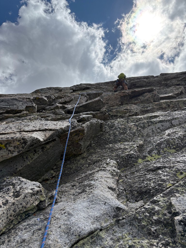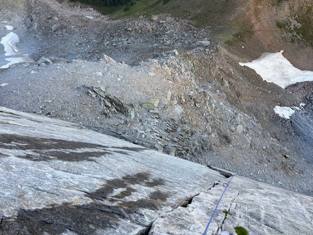 The rock quality was just terrible on this side of the ridge. The route description suggests taking the arete or left side, so we worked our way back left. Ryan went out of sight around the arete, then I heard the mountain starting to crumble. A series of massive rocks were crashing down. My heart sank as I jumped to the worst conclusion – whatever rocks Ryan had stepped on released and he was going down with those rocks. There was no gear between us, only 15 feet of rope. I anxiously watched the rope in front of me, fully expecting it pull tight and take me down too. Death imminent…
