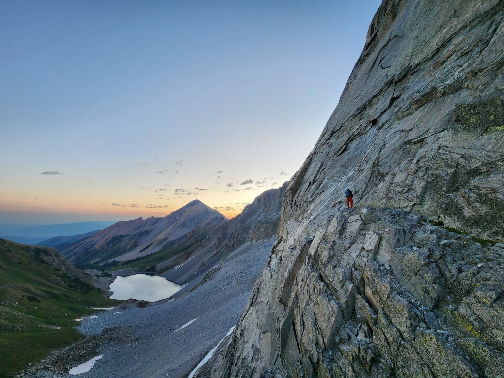We set off around 5 am with head lamps on, and by the time we reached Capitol Pass, dawn was draped across the Elk Range. Ryan and I were both feeling giddy, optimistic, and psyched as the route came into view. The base of the climb is above a short scree slope. You access the route by walking out on an exposed, narrow ledge. (“Exposure” will almost certainly be the word of the day, so please pardon my limited vocabulary.)
